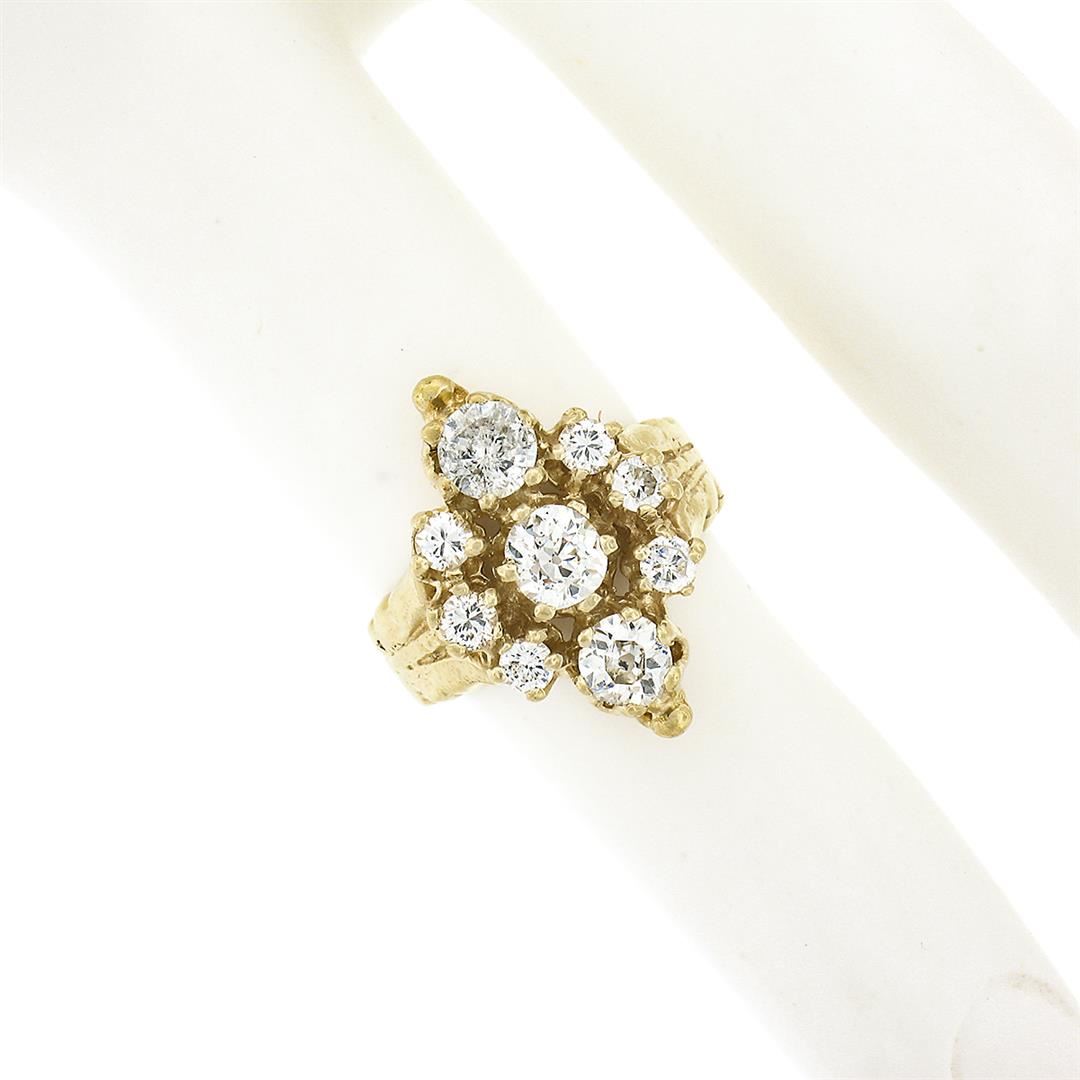 A solid 14k yellow gold ring, with 3 old european cut natural diamonds (H/ - SI1/I1 ; 0.90ctw), and 6 old transitional cut natural diamonds (H/I - VS2 ; 0.30ctw). The ring is size 2.0, weighs a total of 4.07 grams, and measures 17.75mm wide.