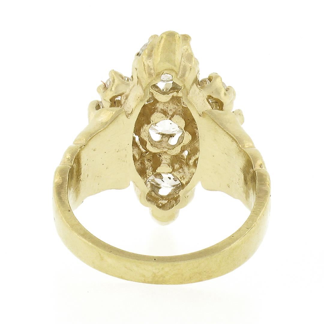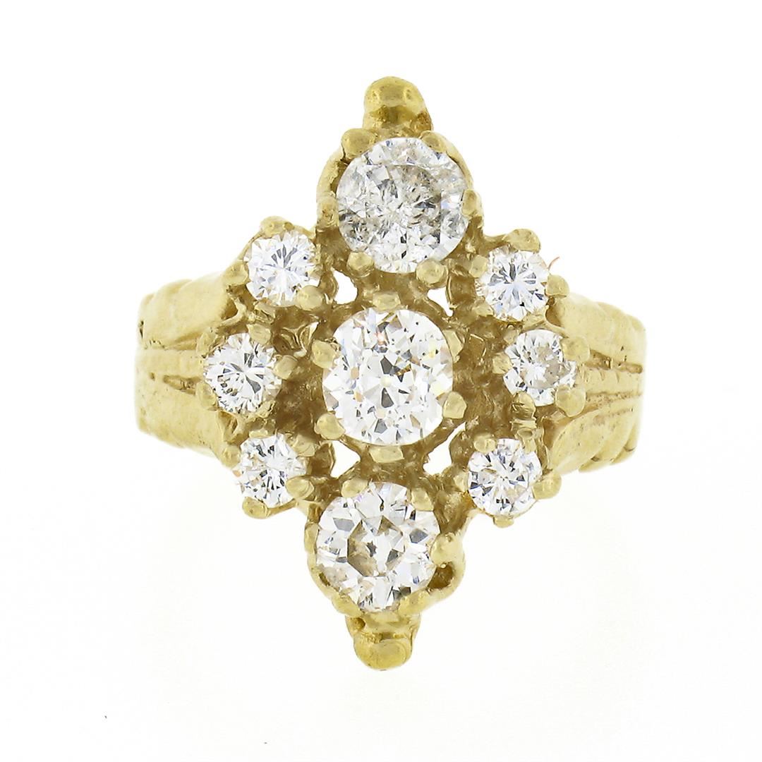 A solid 14k yellow gold ring, with 3 old european cut natural diamonds (H/ - SI1/I1 ; 0.90ctw), and 6 old transitional cut natural diamonds (H/I - VS2 ; 0.30ctw). The ring is size 2.0, weighs a total of 4.07 grams, and measures 17.75mm wide.