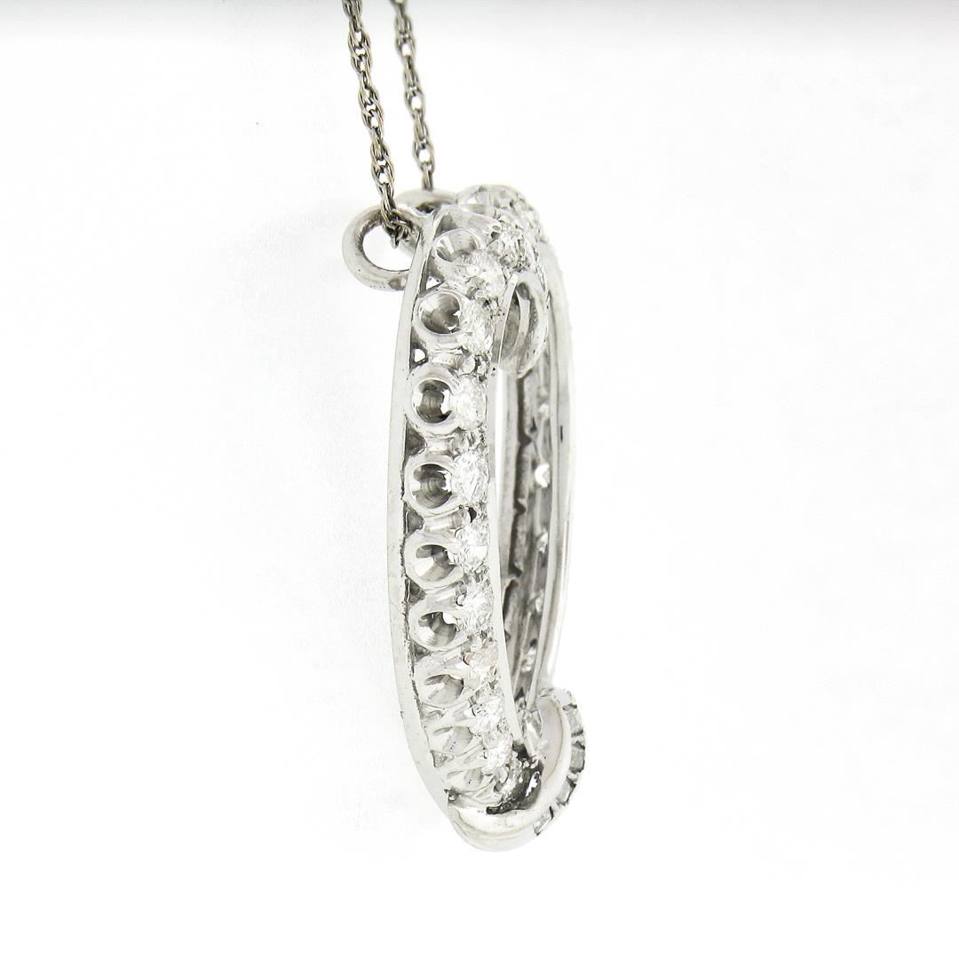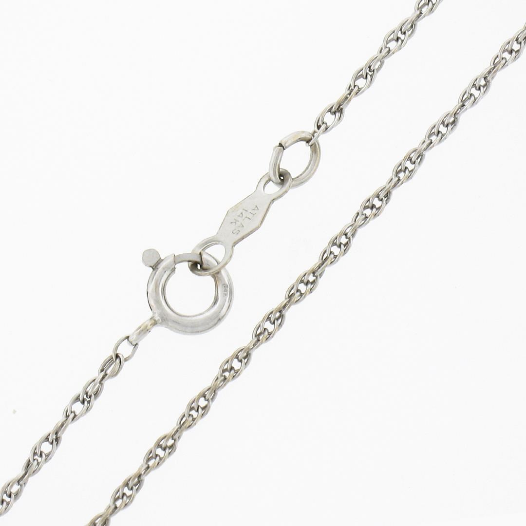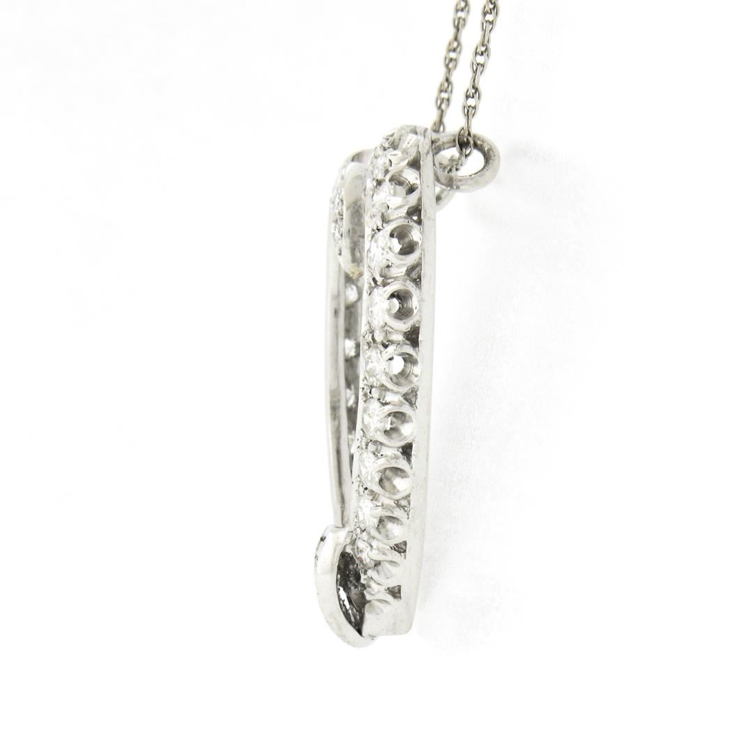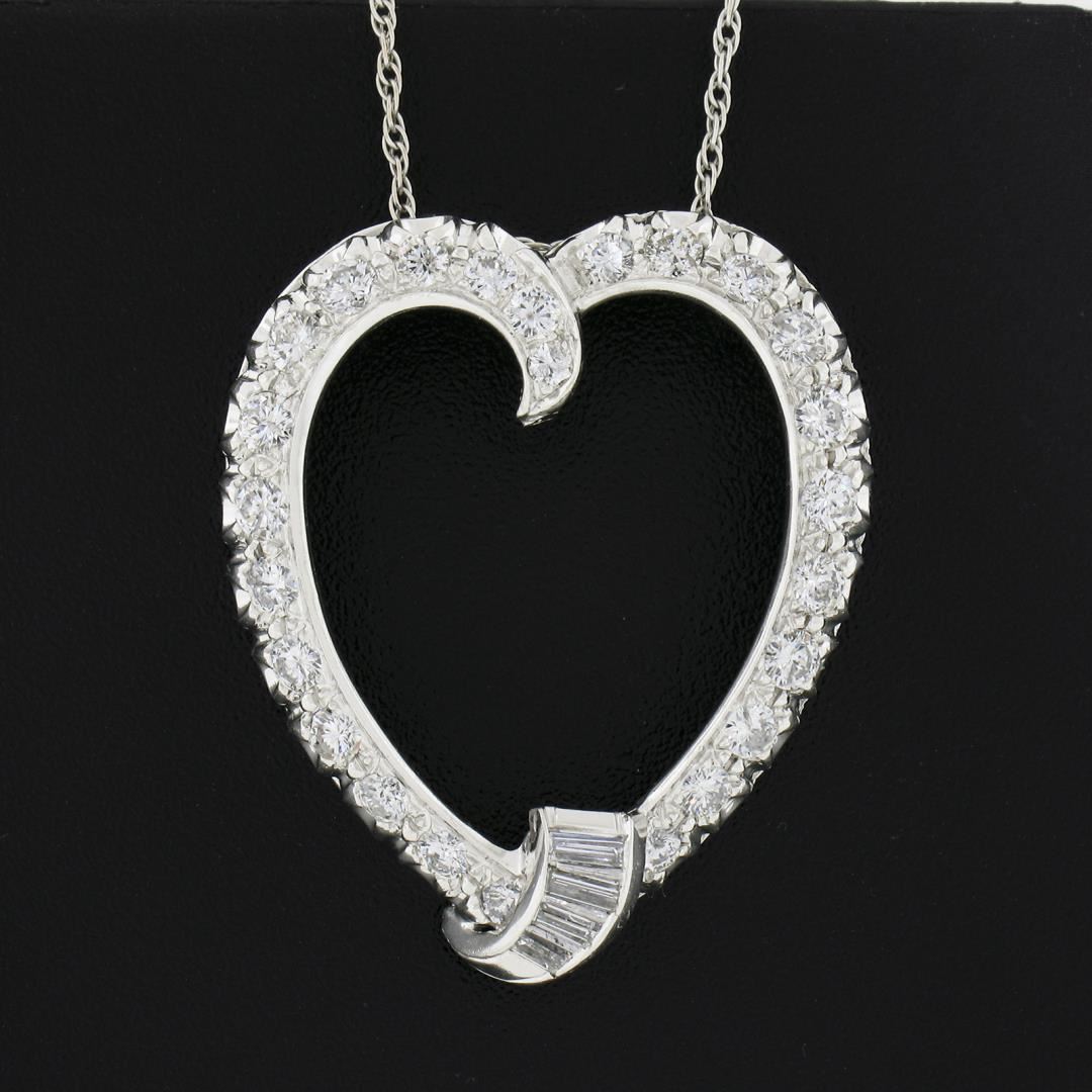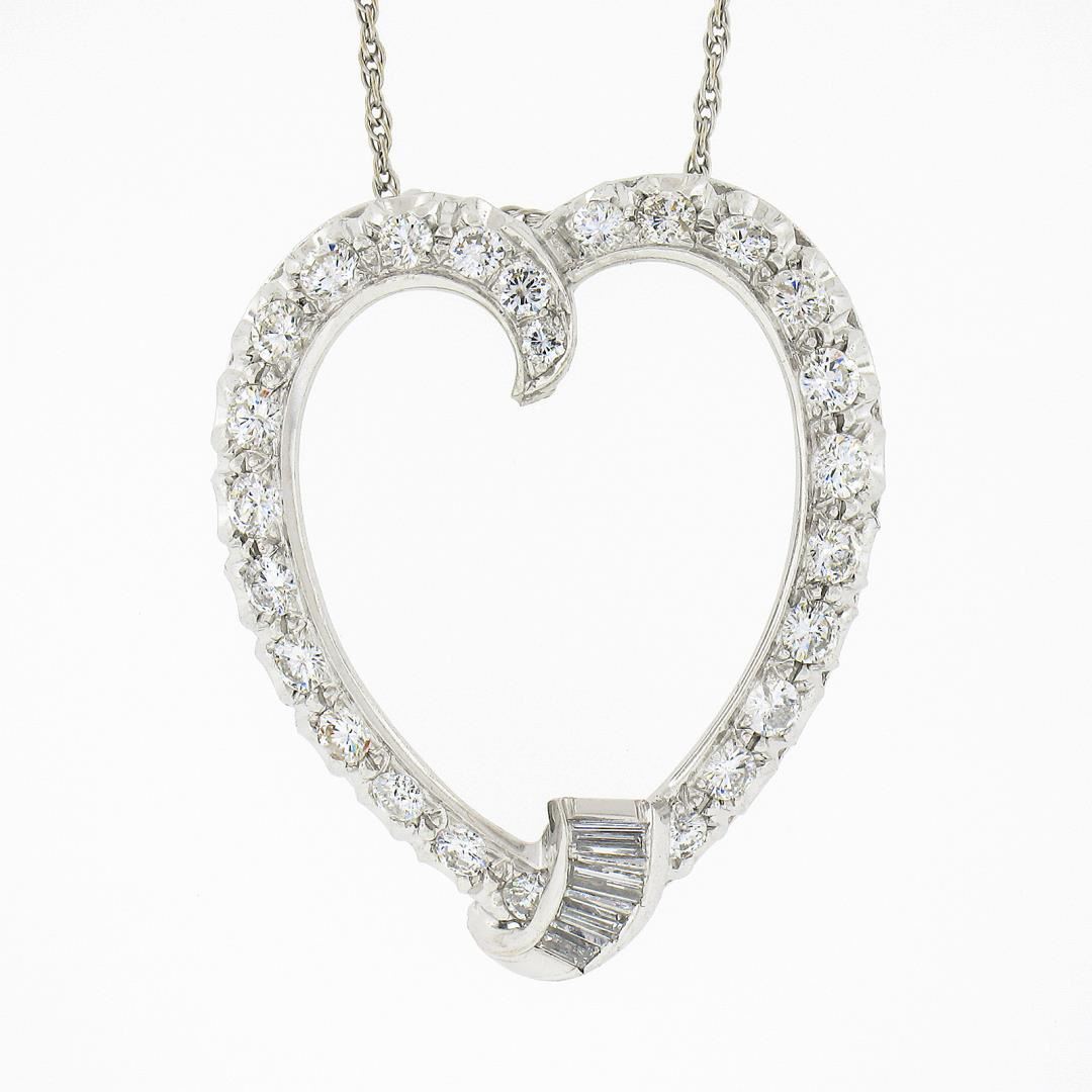 A vintage solid 14k white gold heart pendant necklace, with 25 round brilliant cut natural diamonds (G/H - SI1/SI2 ; 1.10ctw), & 4 Baguette cut natural diamonds (G/H - VS2/SI1 ; 0.16ctw). 16.5 inch rope link chain, 6.88 grams total weight, pendant measures 32x27.20mm.