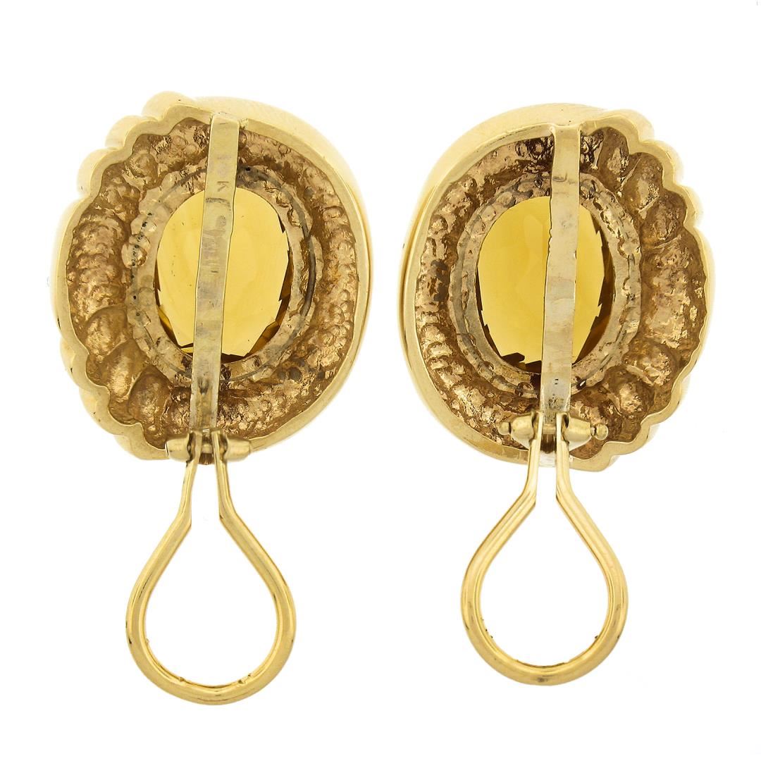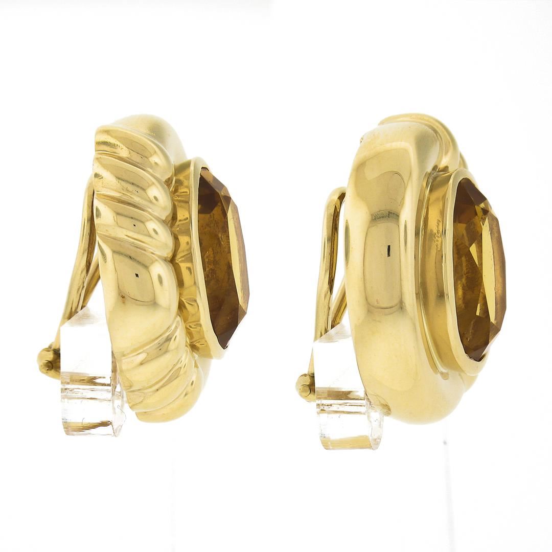 A vintage 14k yellow gold clip on earrings, with 2 oval cut natural citrines (11ctw). The earrings measure approximately 23.3x19.6mm and weigh a total of 20.43 grams.