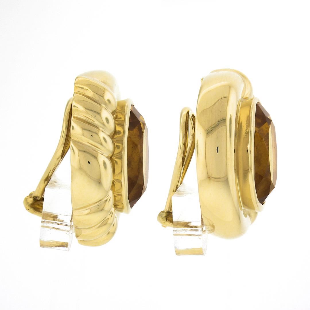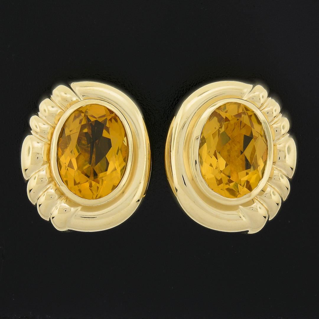 A vintage 14k yellow gold clip on earrings, with 2 oval cut natural citrines (11ctw). The earrings measure approximately 23.3x19.6mm and weigh a total of 20.43 grams.