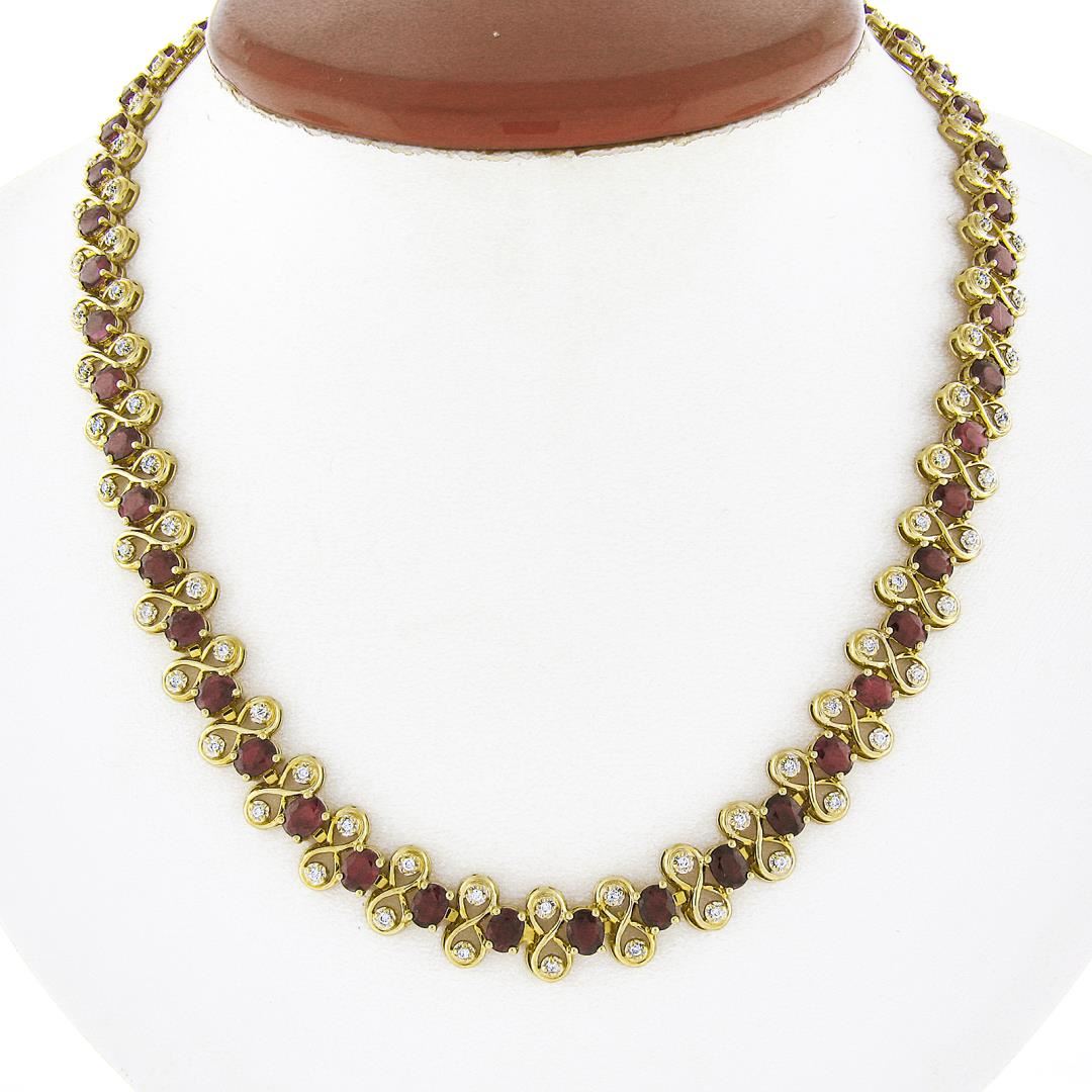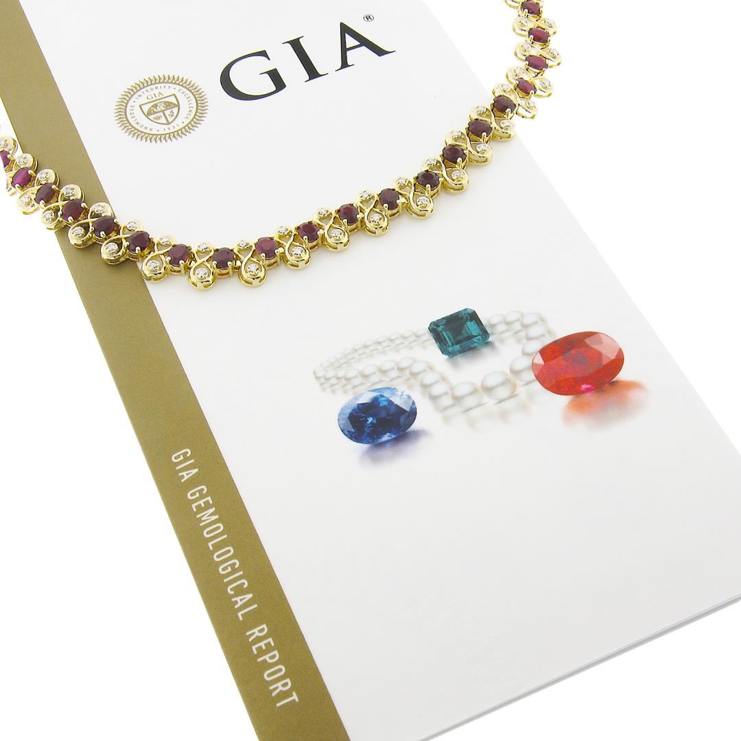 A vintage solid 14k yellow gold necklace, with GIA graded 51 oval cut natural rubies (20.0ctw), and 102 round cut natural diamonds (H/I - SI2/I1 ; 1.00ctw). It weighs a total of 40.80 grams, measures 10.8mm wide, and measures 16.5 inches in length. Comes with all original relevant certifications.