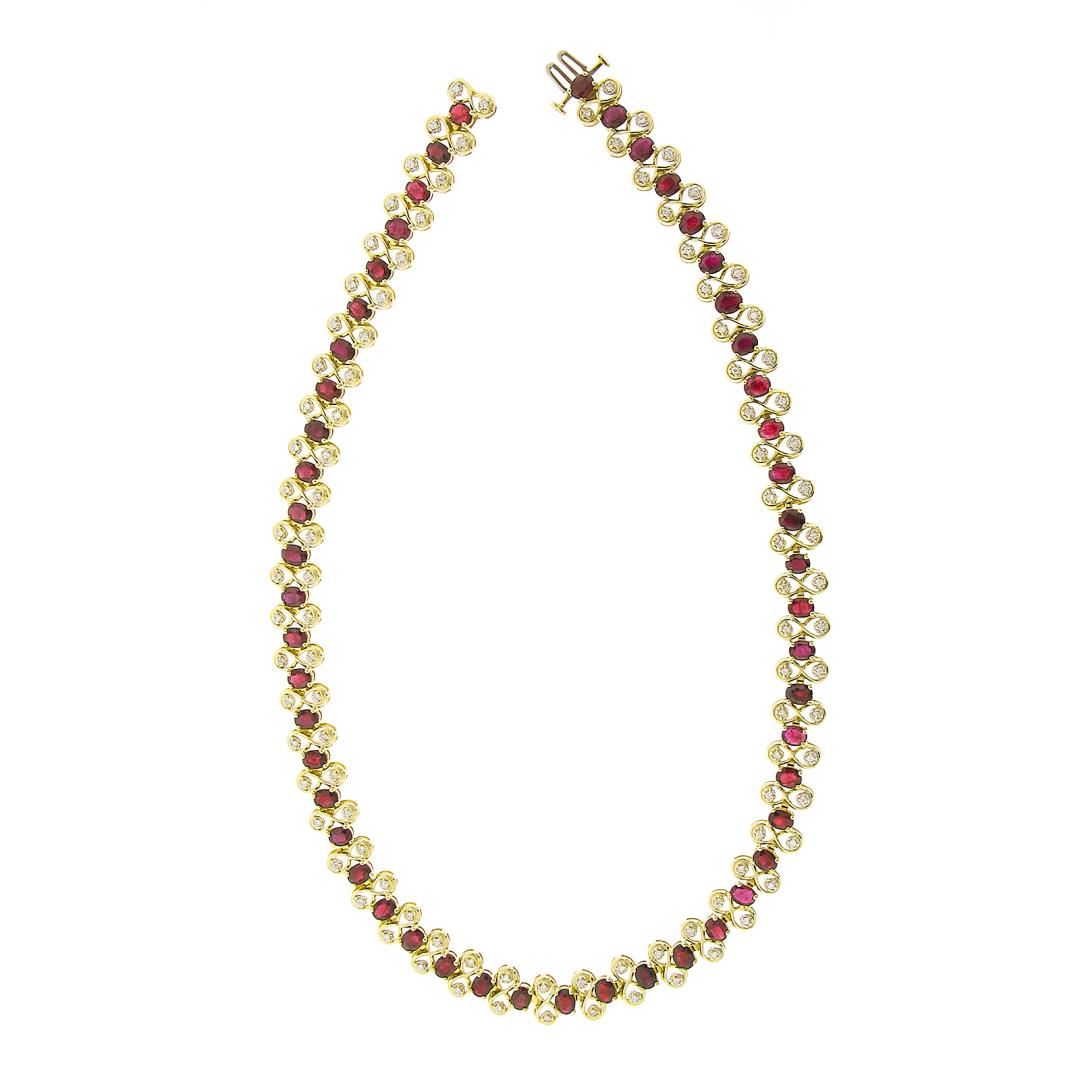 A vintage solid 14k yellow gold necklace, with GIA graded 51 oval cut natural rubies (20.0ctw), and 102 round cut natural diamonds (H/I - SI2/I1 ; 1.00ctw). It weighs a total of 40.80 grams, measures 10.8mm wide, and measures 16.5 inches in length. Comes with all original relevant certifications.