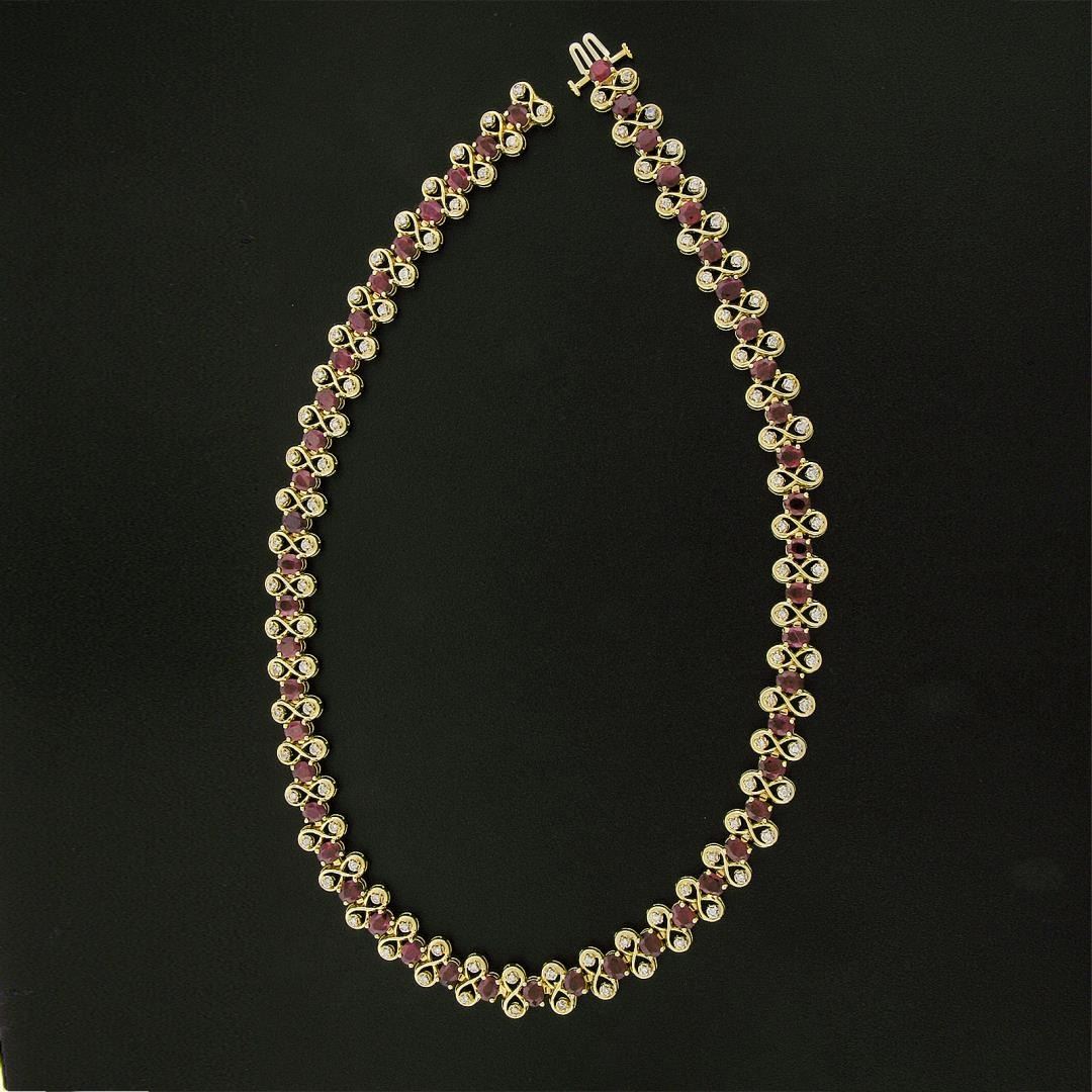 A vintage solid 14k yellow gold necklace, with GIA graded 51 oval cut natural rubies (20.0ctw), and 102 round cut natural diamonds (H/I - SI2/I1 ; 1.00ctw). It weighs a total of 40.80 grams, measures 10.8mm wide, and measures 16.5 inches in length. Comes with all original relevant certifications.