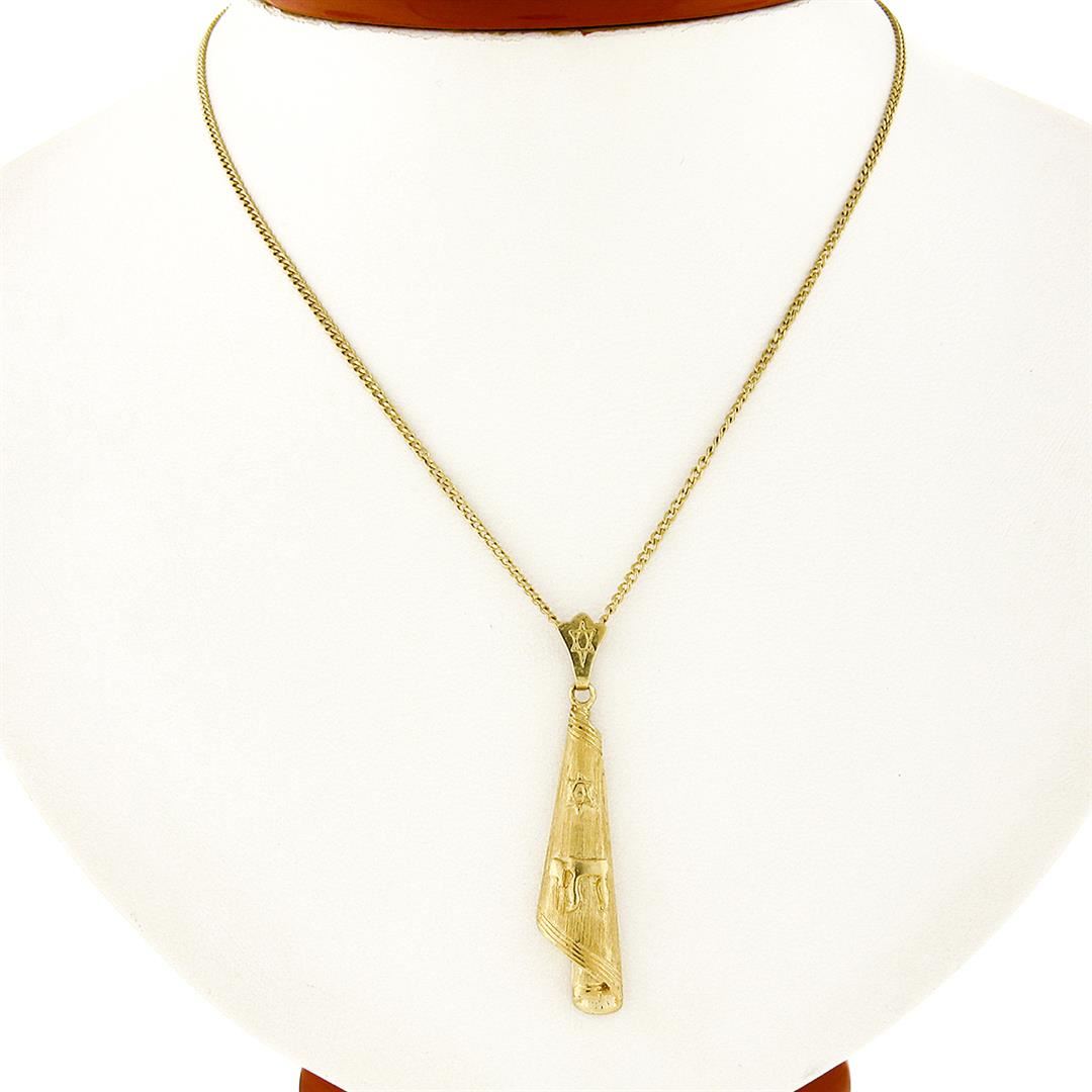 A solid 14k yellow gold chai pendant necklace. The pendant weighs a total of 7.82 grams, measures 44.40x9mm including the bail, and 24 inch curb link chain.