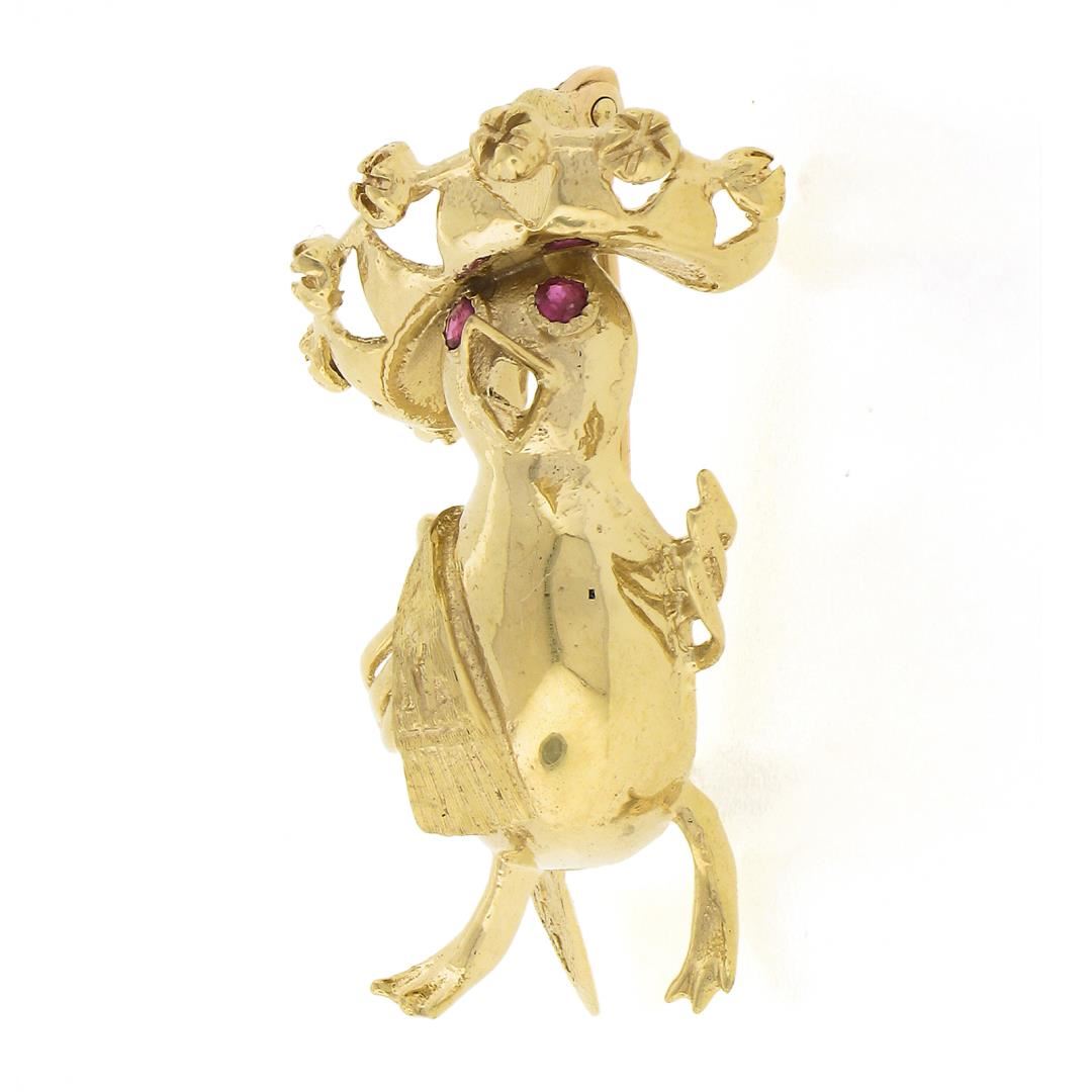 A vintage solid 14k yellow gold bird brooch, with 2 round cut natural rubies (0.04ctw). Measures 31.9x33.6mm and weighs a total of 5.72 grams.