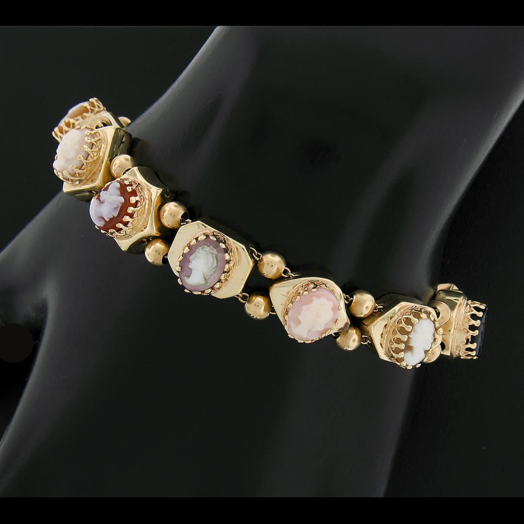 A vintage solid 14k yellow gold charm bracelet, with 12 oval carved cameo agate, mother of pearl, shell, & black onyx (8.3x6.1mm each ). It weighs a total of 25.12 grams, measures 13.25mm wide, and measures 6.25 inches in length.