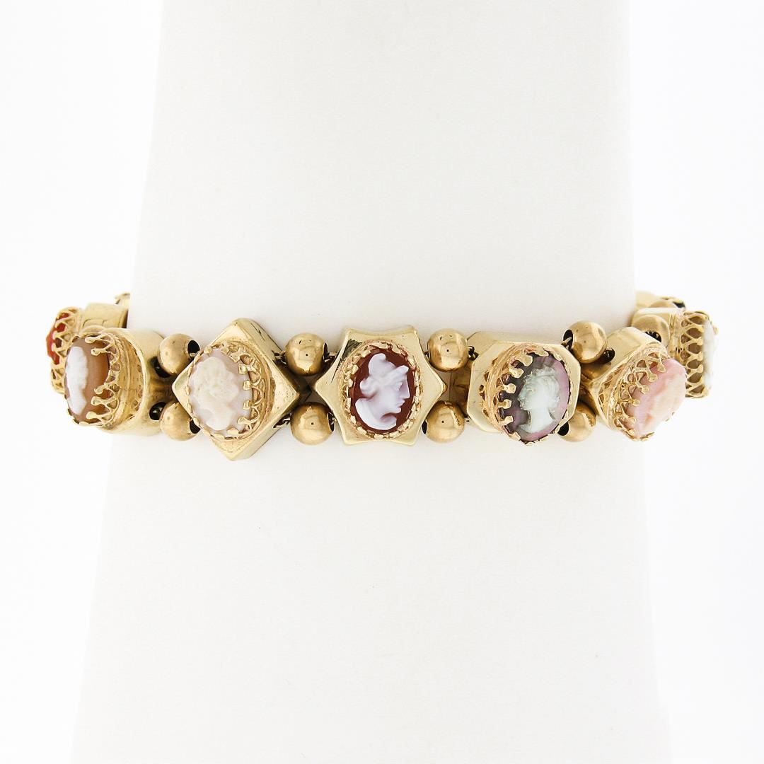 A vintage solid 14k yellow gold charm bracelet, with 12 oval carved cameo agate, mother of pearl, shell, & black onyx (8.3x6.1mm each ). It weighs a total of 25.12 grams, measures 13.25mm wide, and measures 6.25 inches in length.