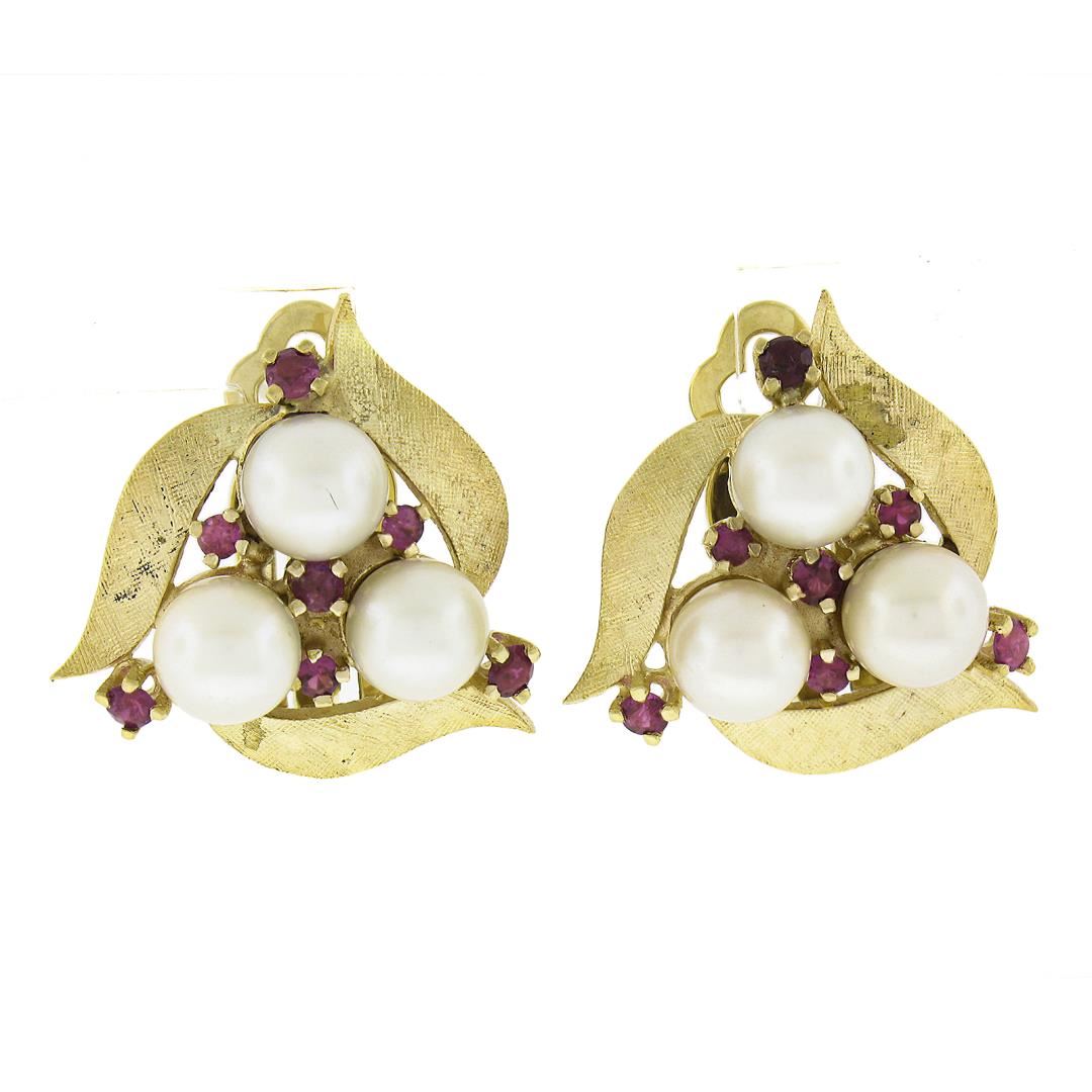 A vintage solid 14k yellow gold earrings, with 6 round shape cultured pearls ( 6.5mm each), and 14 round cut natural rubies (0.56ctw). The earrings measure approximately 22.6x22.5mm and weigh a total of 10.98 grams.
