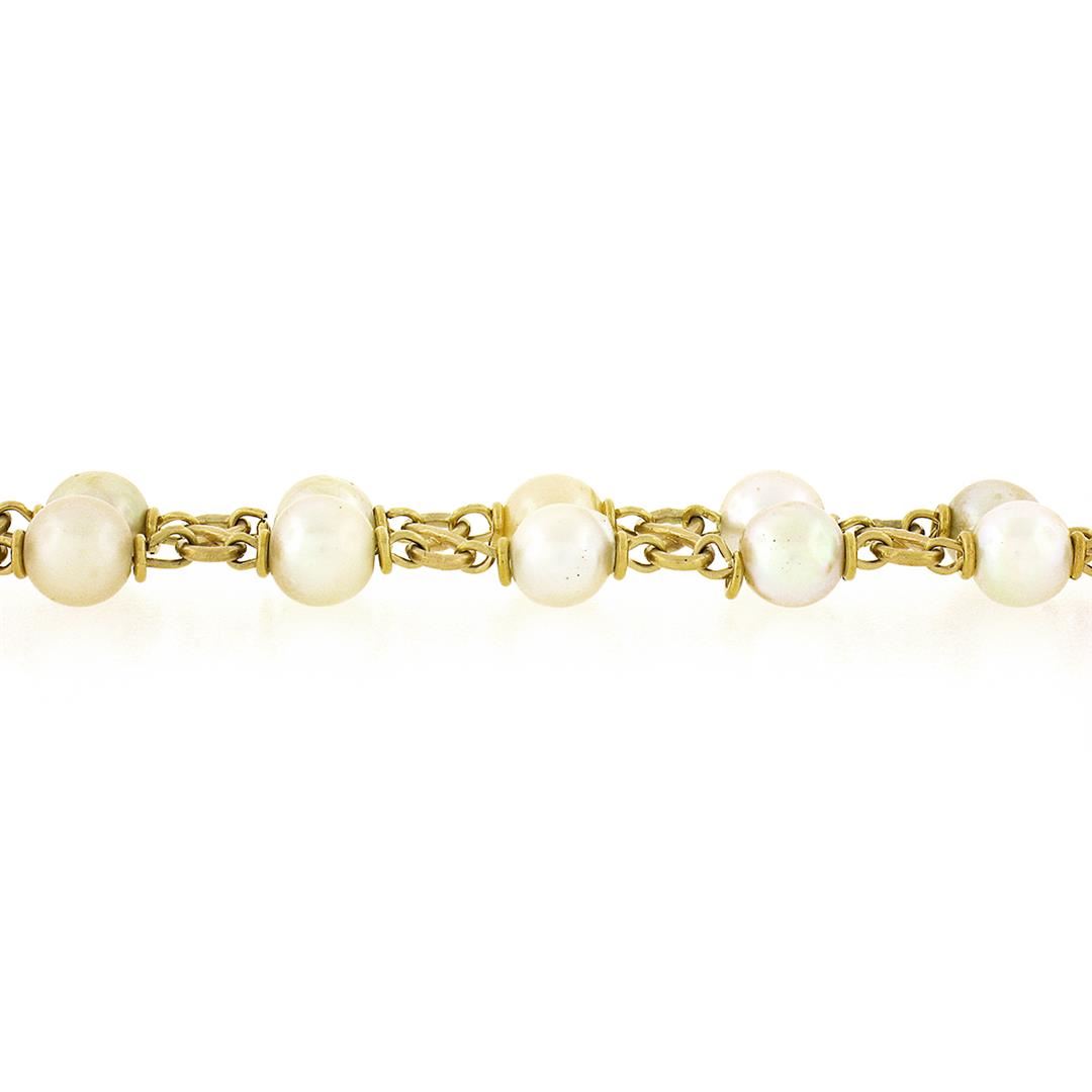 A slid 14k yellow gold dual row link bracelet, with 34 round shape cultured pearls (5.8mm to 3.1mm). It weighs a total of 10.87 grams, measures 11.30mm wide, and measures 6.75 inches in length.
