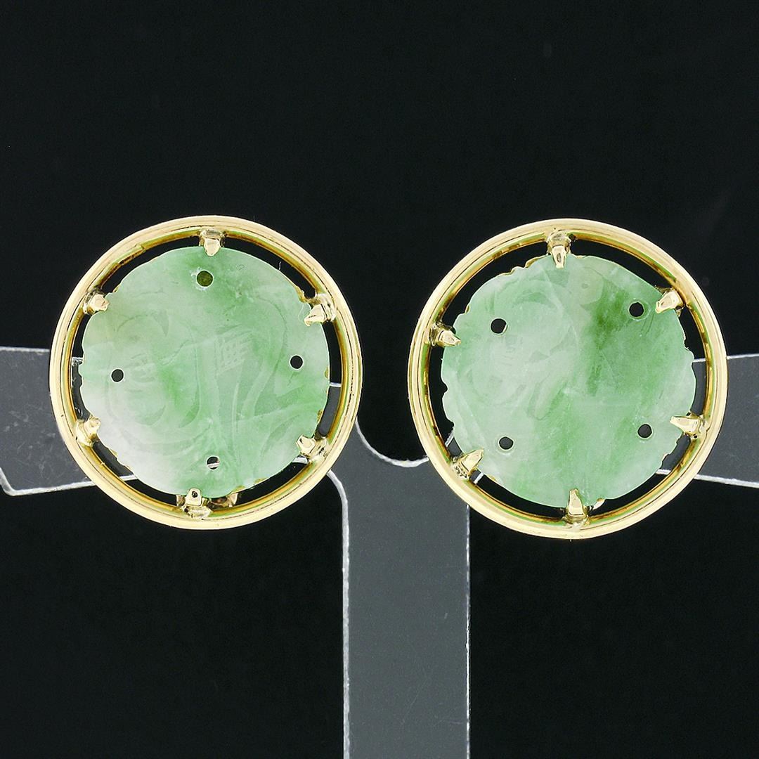 A vintage solid 14k yellow gold clip on earrings, with 2 round carved natural jade (15.3mm). The earrings measure approximately 19.35mm in diameter and weigh a total of 8.34 grams.