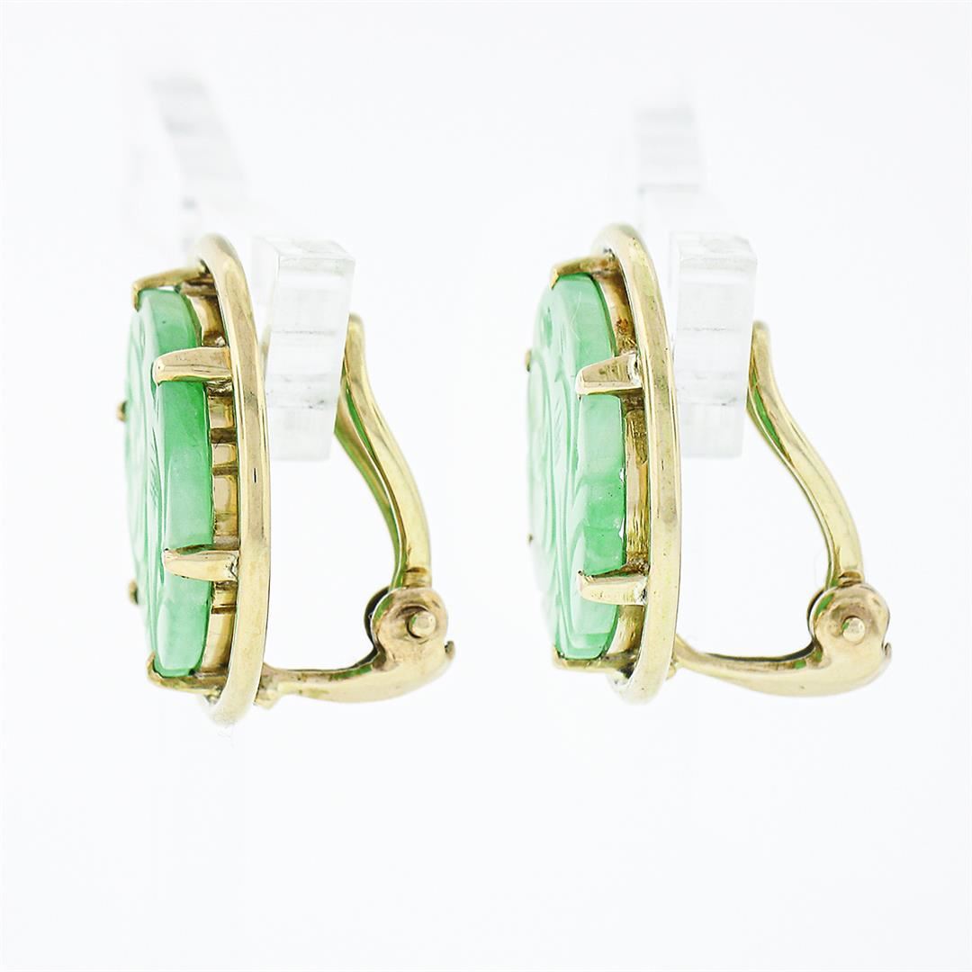 A vintage solid 14k yellow gold clip on earrings, with 2 round carved natural jade (15.3mm). The earrings measure approximately 19.35mm in diameter and weigh a total of 8.34 grams.