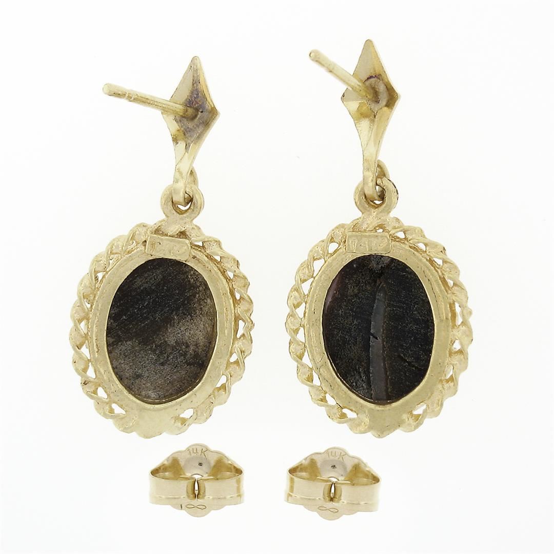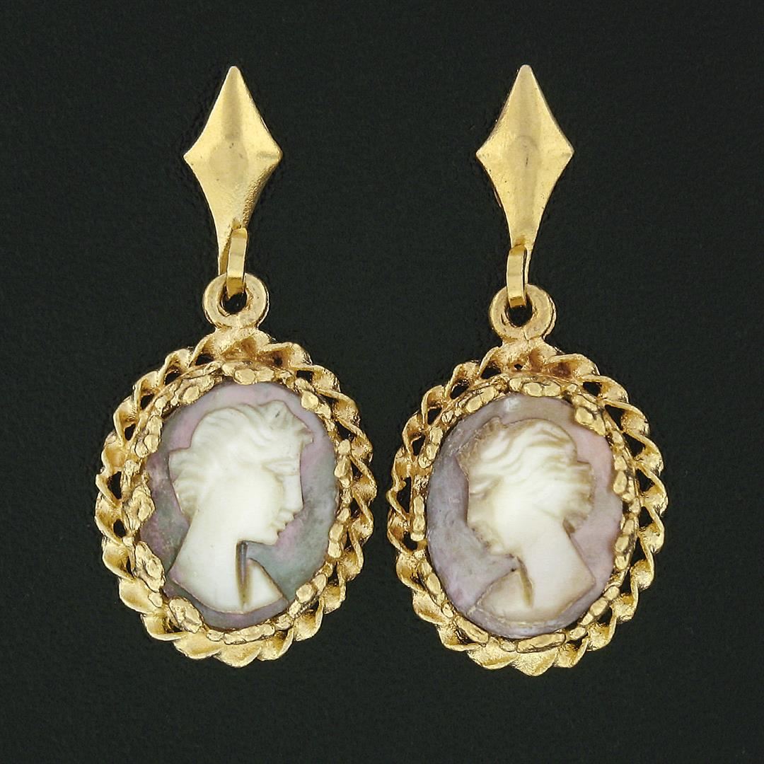 A vintage solid 14k yellow gold dangle drop earrings, with 2 oval shape cameo carved mother of pearl (8.50x10.20mm ). The earrings measure approximately 25.3x11.5mm and weigh a total of 3.1 grams.