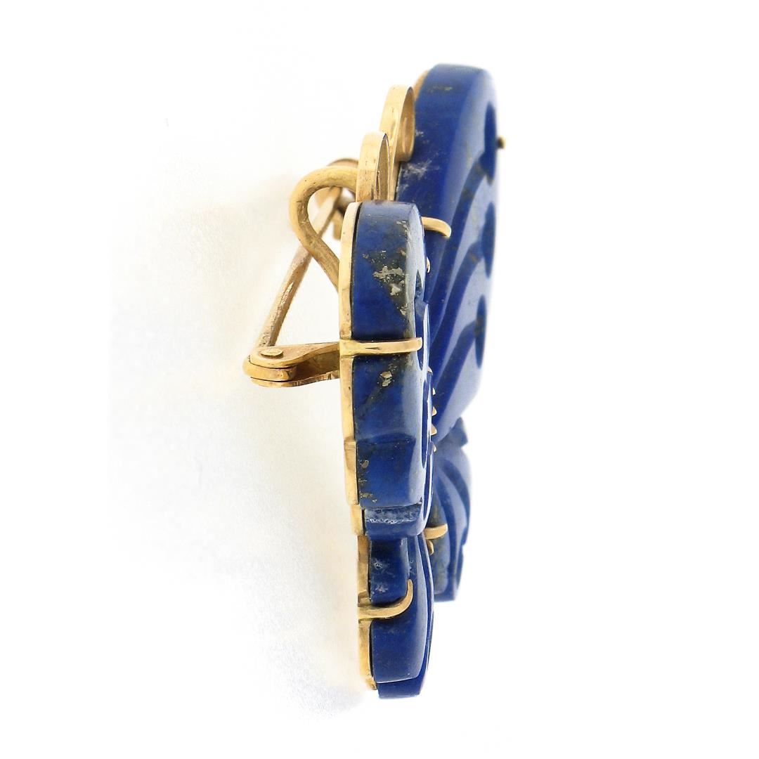 A vintage solid 14k yellow gold brooch pendant, with 2 custom cut carved natural lapis lazuli (30x22.3mm each). Measures 30.5x48.4mm and weighs a total of 11.75 grams.