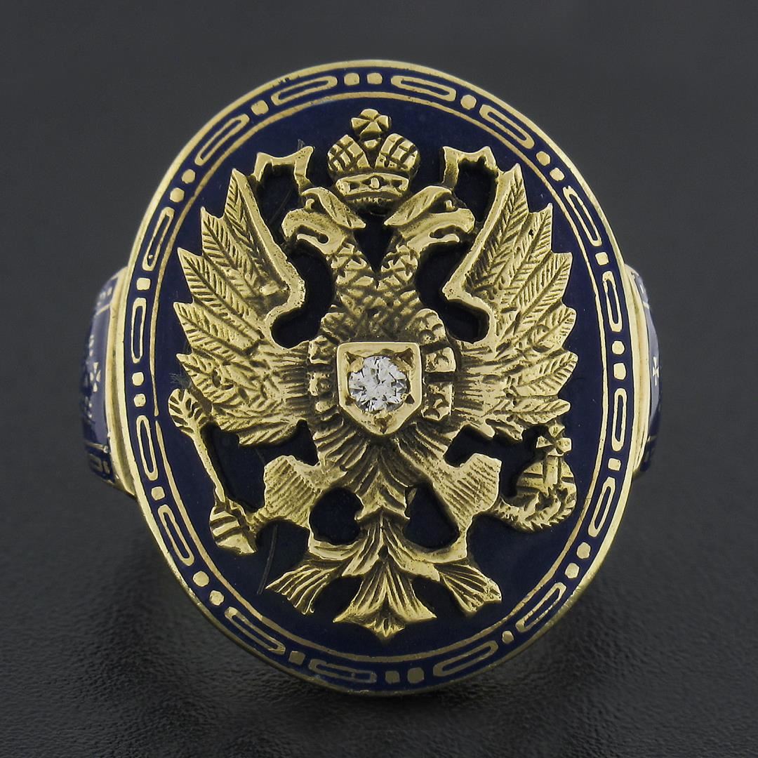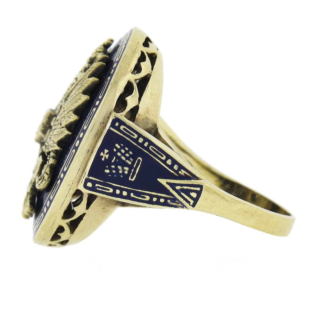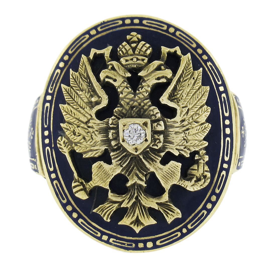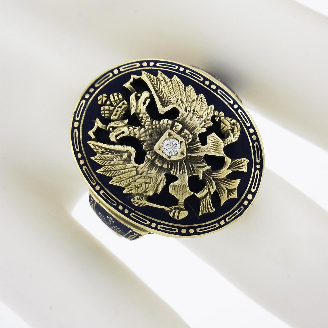 A vintage solid 14k yellow gold ring with blue enamel work & 1 round cut natural diamond (H - SI1 ; 0.04ct). The ring is size 8.0, weighs a total of 11.96 grams, and measures 24.1mm wide.
