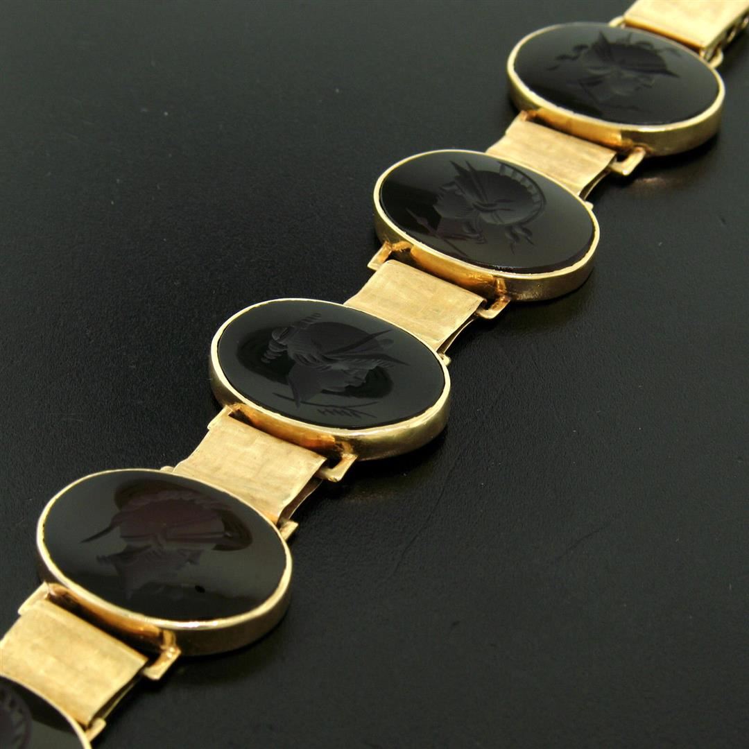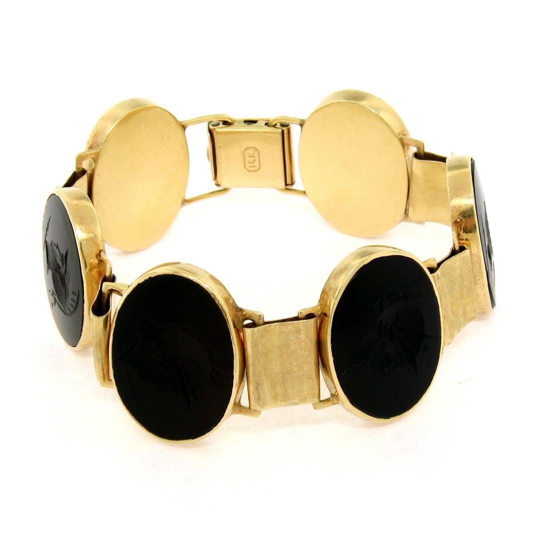Vintage 14K Gold Florentine Large Dark Carnelian Carved Intaglio Knight Bracelet. Please see photos and description for all available information. A vintage solid 14k yellow gold bracelet, featuring 6 oval shape carved natural carnelian (23.75x17.85mm). I