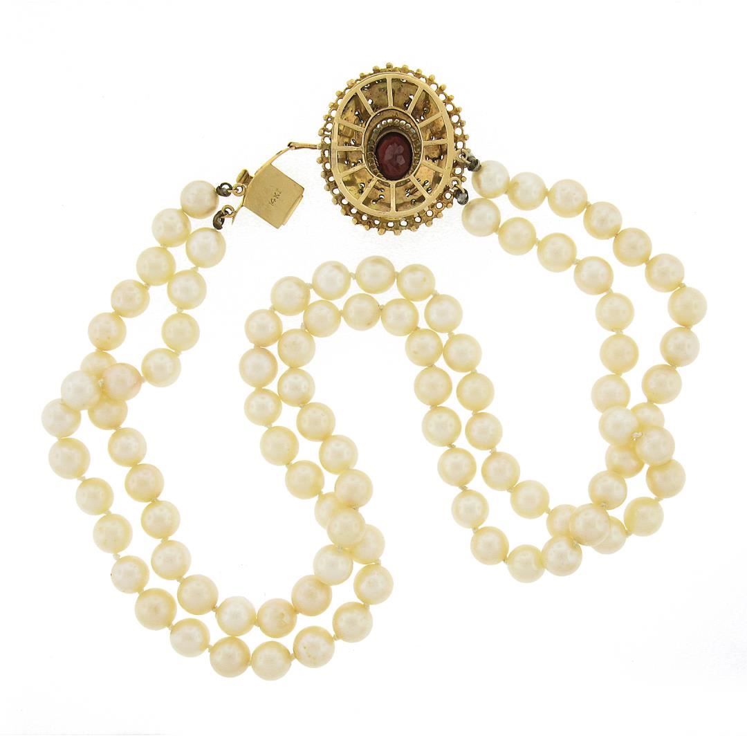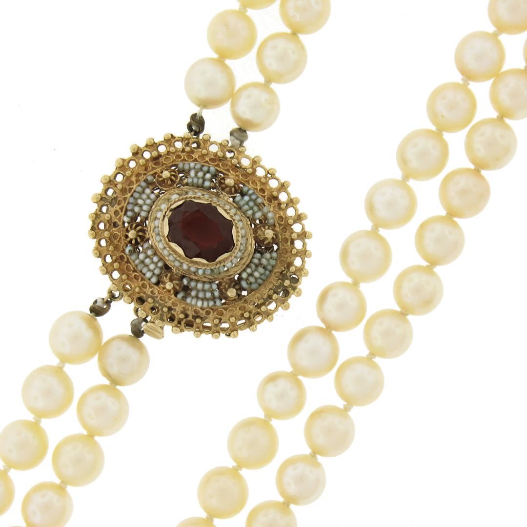 Vintage 14K Gold Garnet & Seed Beaded Clasp Dual Strand 7.4-7.8mm Pearl Necklace