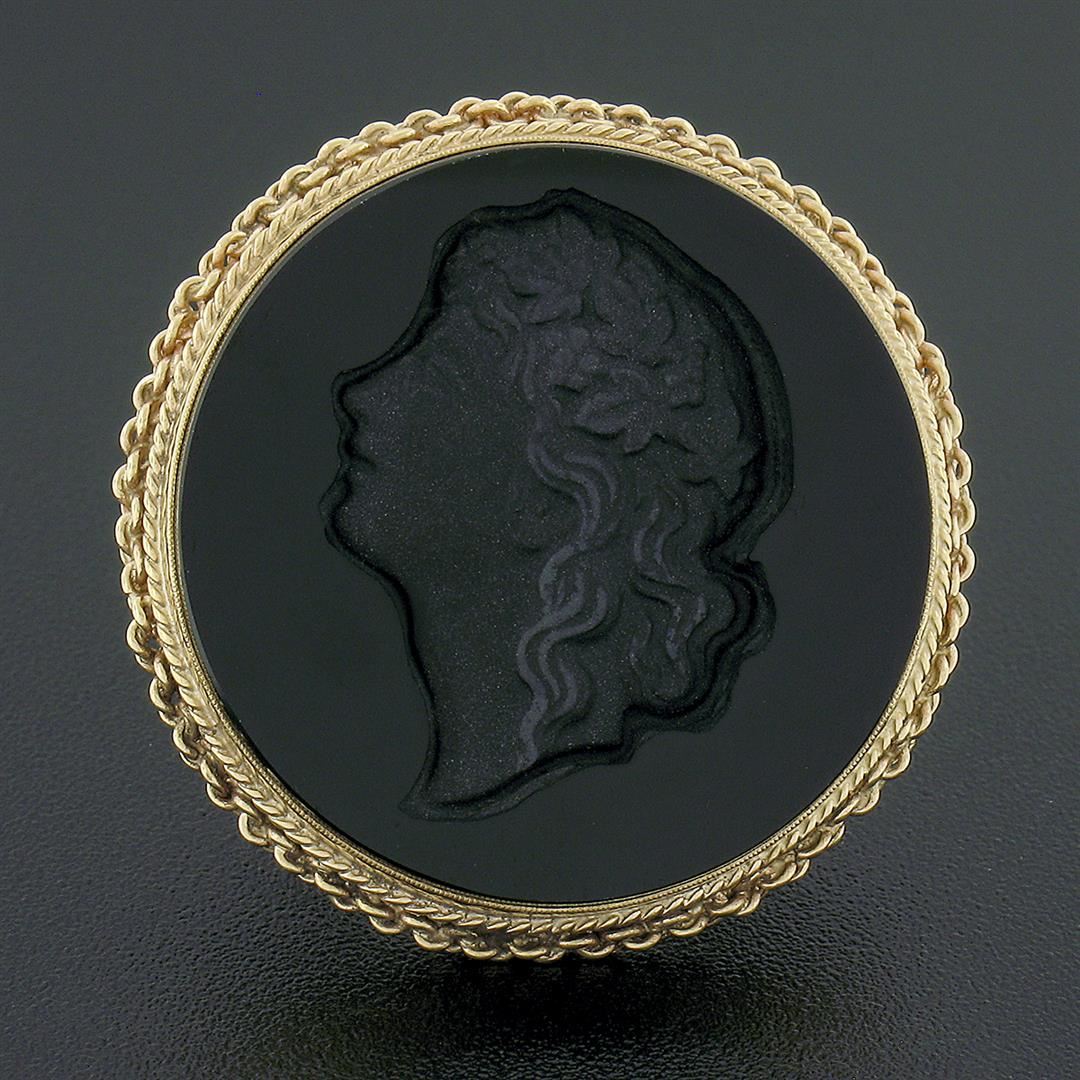 A solid 14k yellow gold platter ring, with 1 round carved intaglio natural black onyx (29.60mm). The ring is size 6.5, weighs a total of 10.83 grams, and measures 34.30mm in diameter.