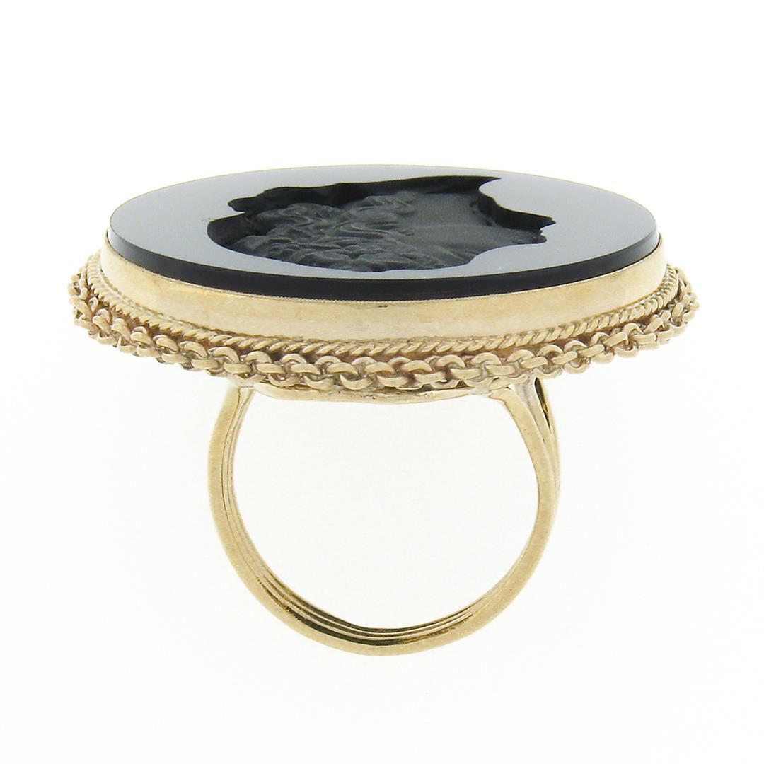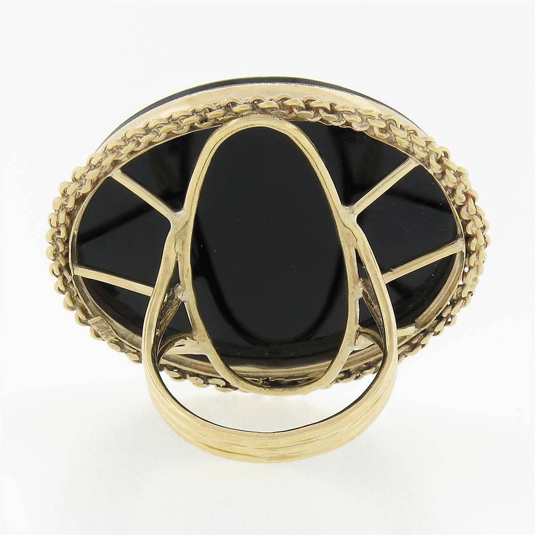 A solid 14k yellow gold platter ring, with 1 round carved intaglio natural black onyx (29.60mm). The ring is size 6.5, weighs a total of 10.83 grams, and measures 34.30mm in diameter.