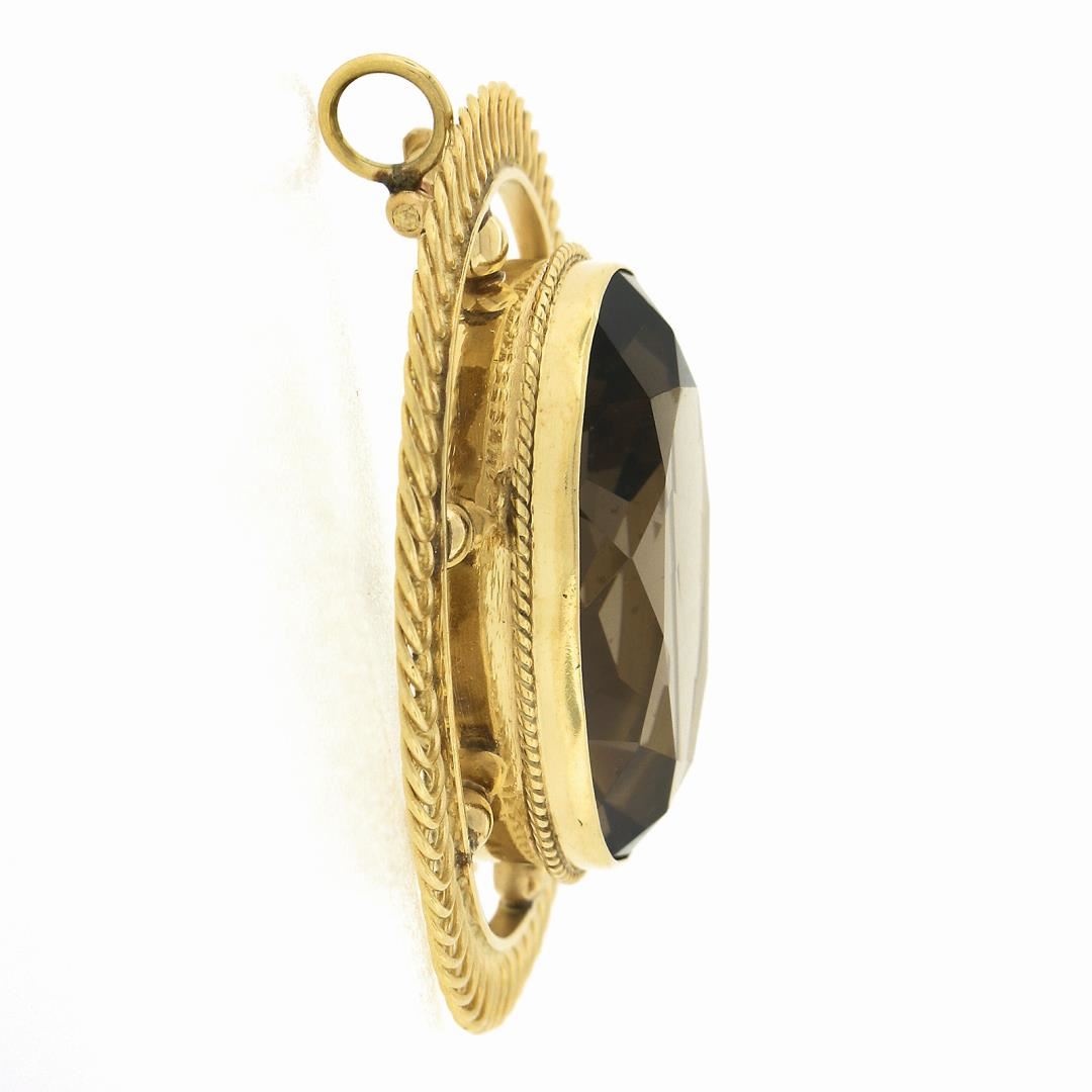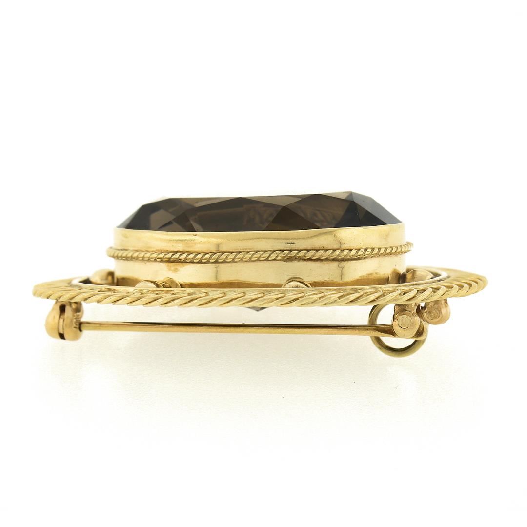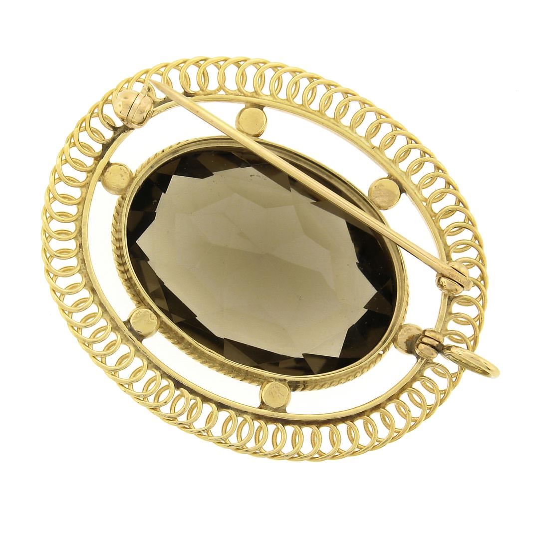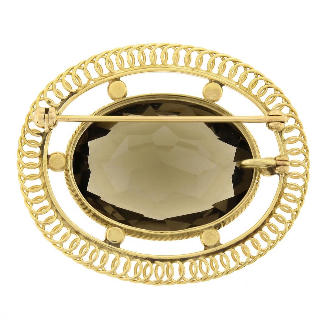 A vintage solid 14k yellow gold brooch, with 1 oval cut natural smoky quartz (25.1x17.9mm). Measures 33.2x42.2mm and weighs a total of 11.89 grams.