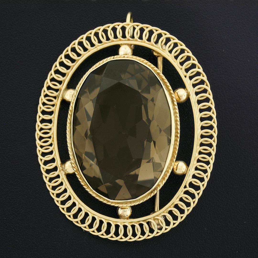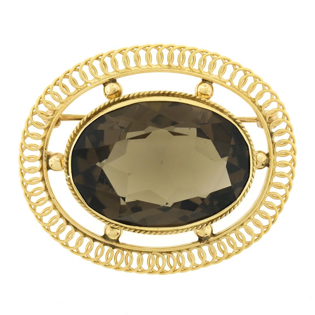 A vintage solid 14k yellow gold brooch, with 1 oval cut natural smoky quartz (25.1x17.9mm). Measures 33.2x42.2mm and weighs a total of 11.89 grams.
