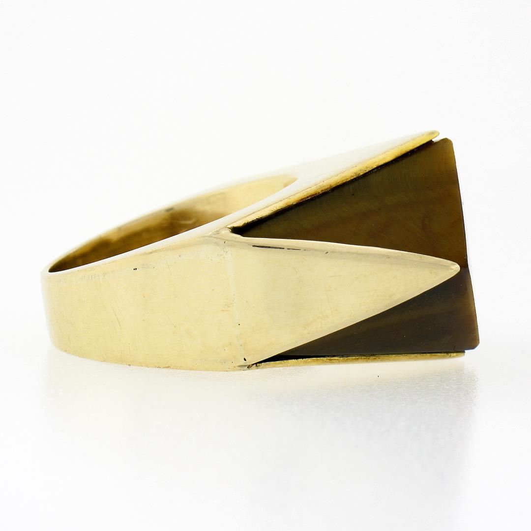 A vintage solid 14k yellow gold geometric ring, featuring a custom cut natrual genuine tiger's eye (23.7x14.9mm). The ring is size 6.5, weighs a total of 17.14 grams, and measures 16.20mm wide.