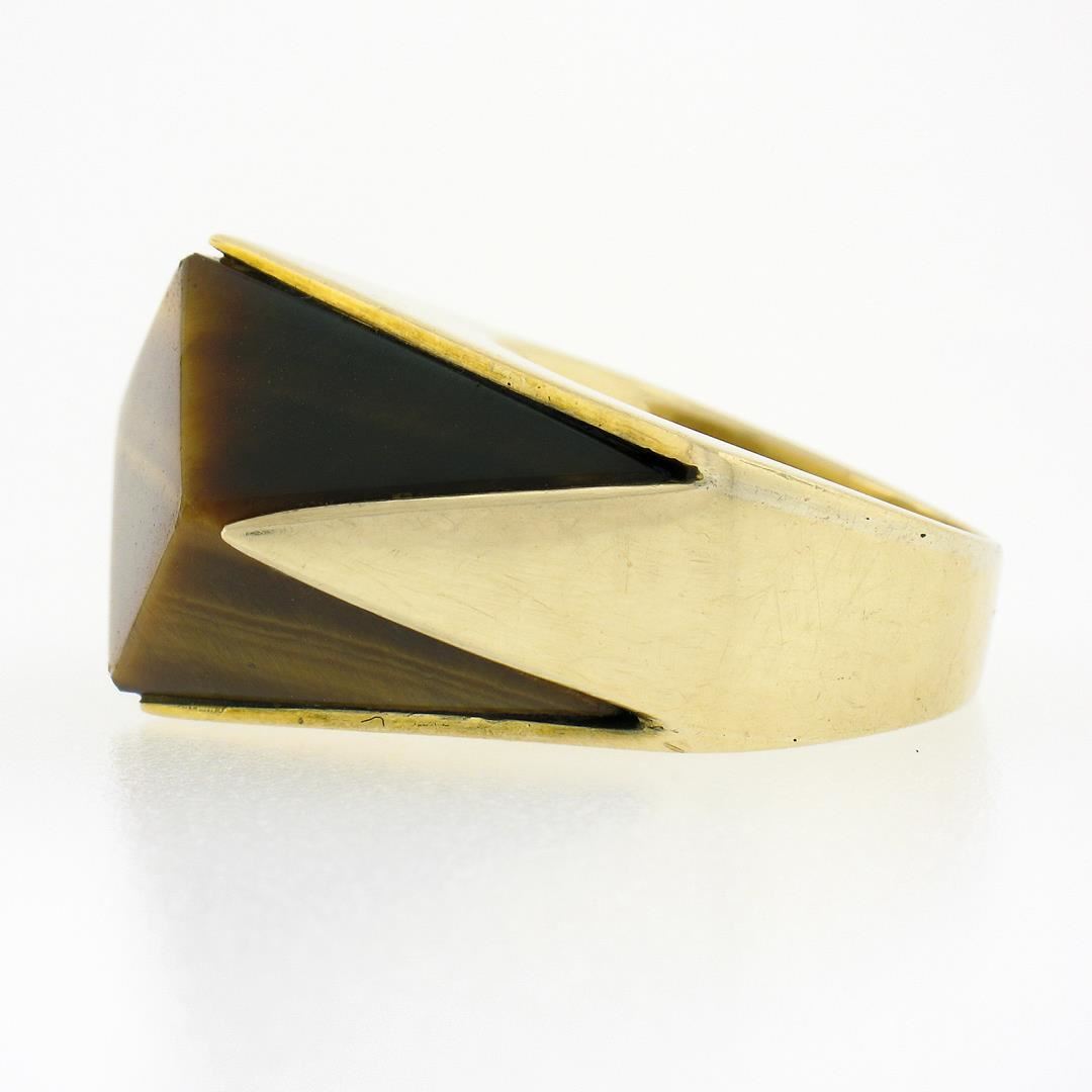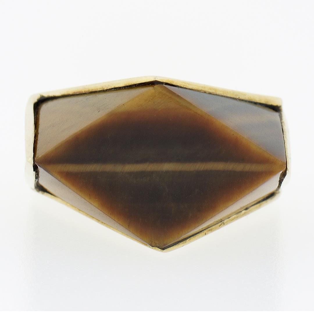 A vintage solid 14k yellow gold geometric ring, featuring a custom cut natrual genuine tiger's eye (23.7x14.9mm). The ring is size 6.5, weighs a total of 17.14 grams, and measures 16.20mm wide.
