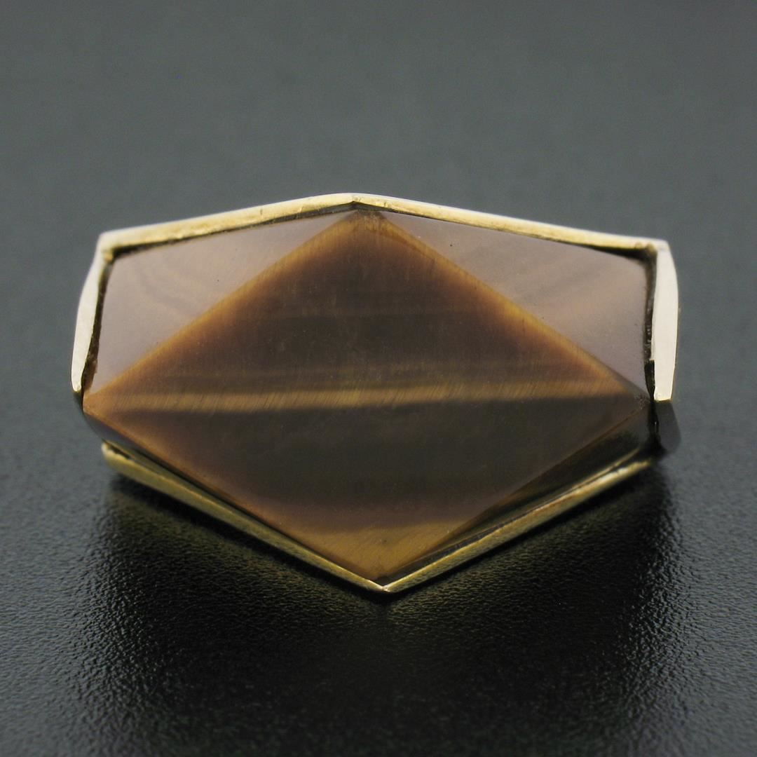 A vintage solid 14k yellow gold geometric ring, featuring a custom cut natrual genuine tiger's eye (23.7x14.9mm). The ring is size 6.5, weighs a total of 17.14 grams, and measures 16.20mm wide.