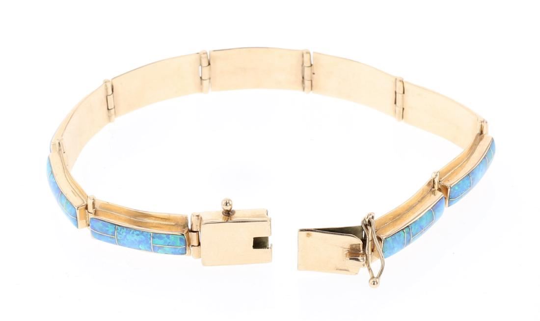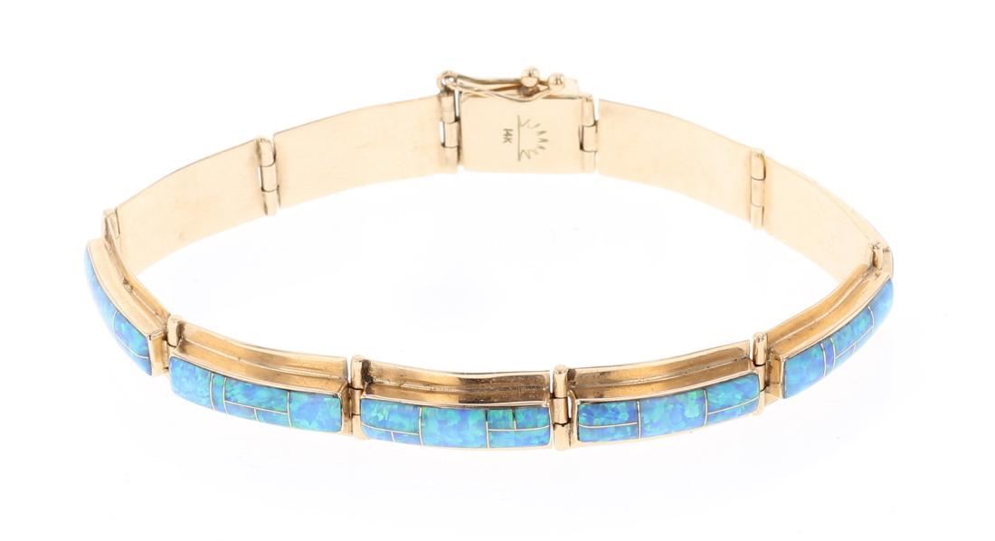 14K Gold | Genuine Opal | Vintage 14K Gold Opal Inlay Link Bracelet | Southwest New Mexico | Weight:14.9 Grams, | Dimensions: Bracelet: 7.5" total length, .25" face width |
