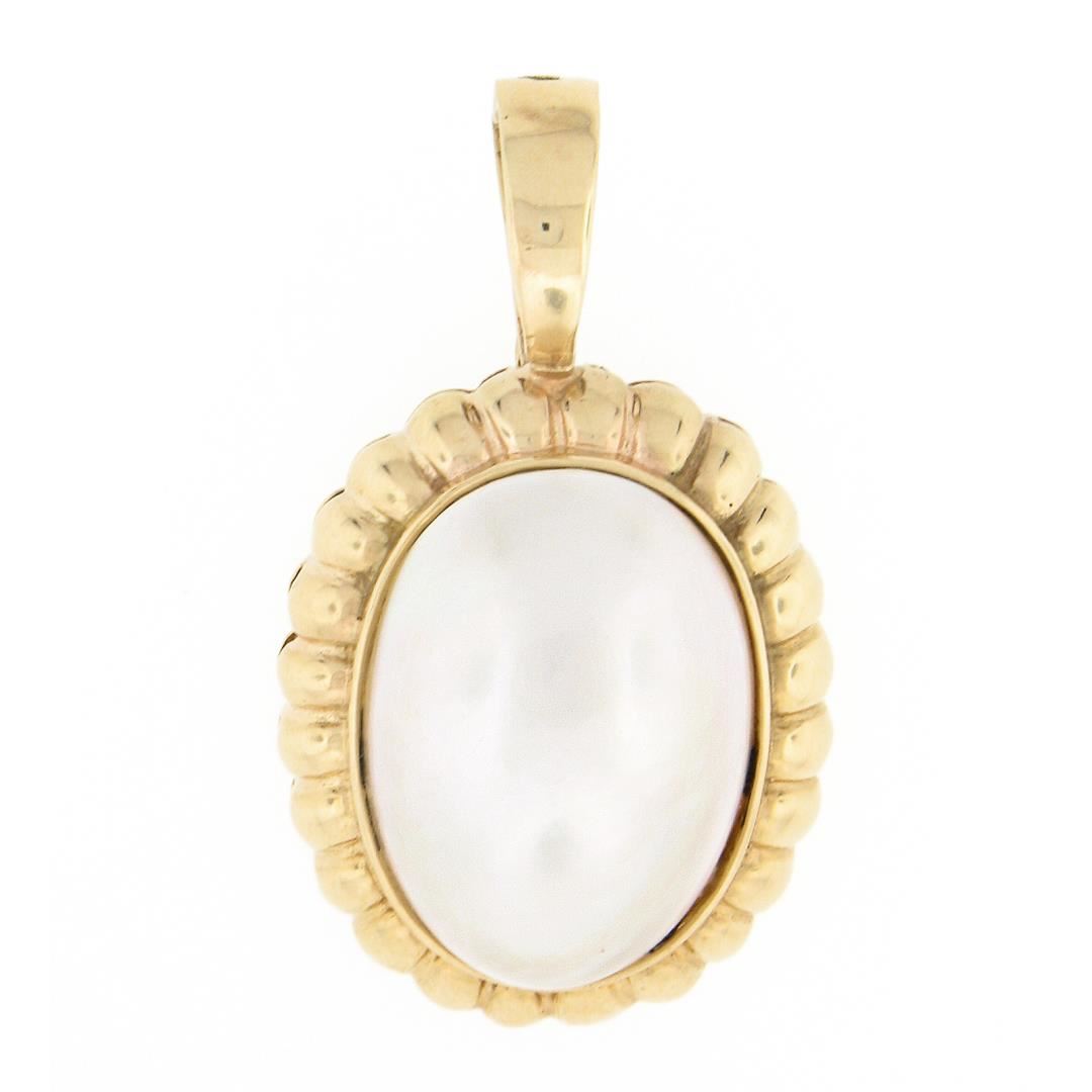 Vintage 14K Gold Oval Bezel Set Mabe Pearl w/ Scalloped Frame Enhancer Pendant