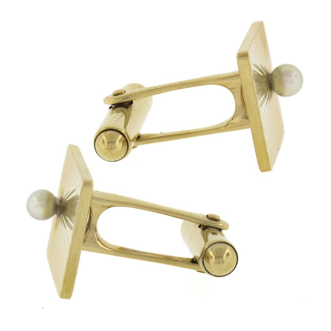 Vintage 14K Gold Rectangular Sunburst Fluted Finish Cuff Links w/ Bead Pearl