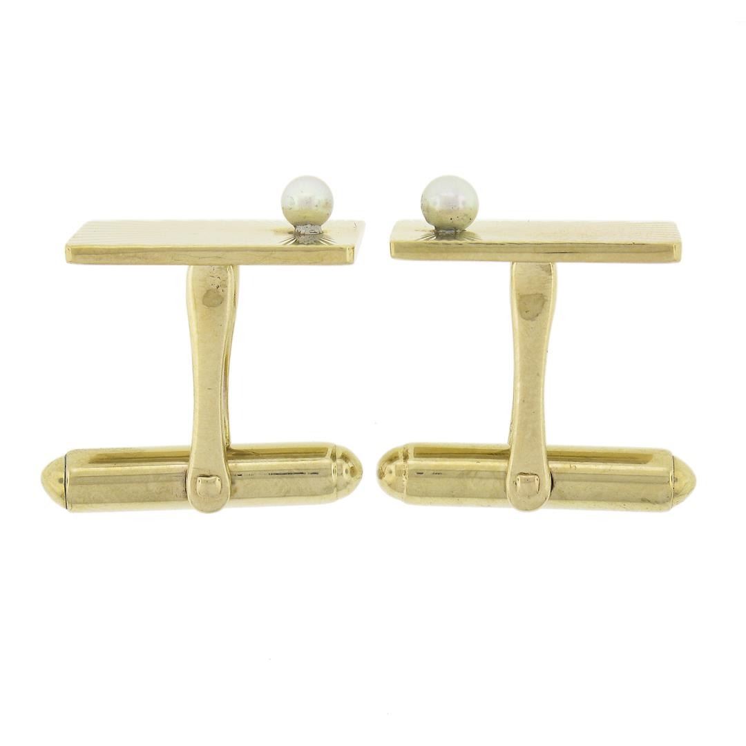 Vintage 14K Gold Rectangular Sunburst Fluted Finish Cuff Links w/ Bead Pearl