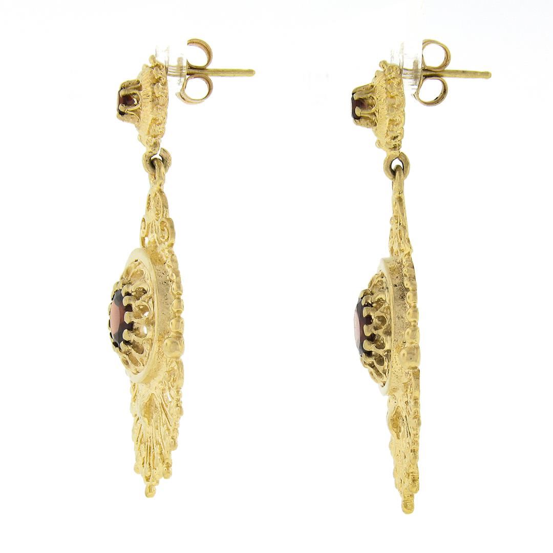 A vintage solid 14k yellow gold drop dangle earrings, with 4 round cut natural garnets (1.87ctw ). The earrings measure approximately 42.4x16.3mm and weigh a total of 8.5 grams.