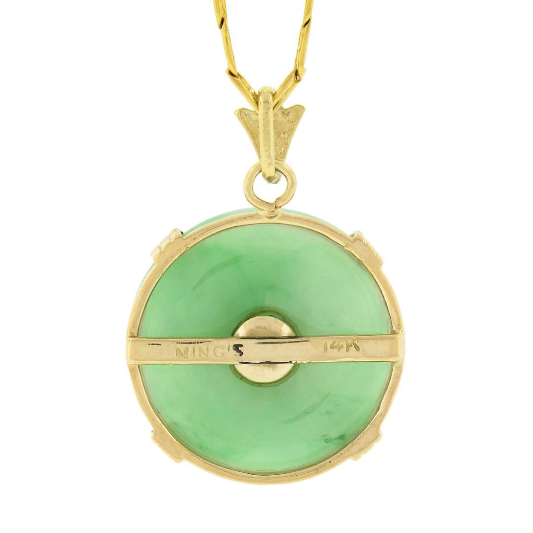 A vintage solid 14k yellow gold pendant necklace, with 1 round pierced cabochon cut natural jade (20.2mm). 17.5 inch mariner link chain, 10.12 grams total weight, pendant measures 28.4x20.2mm.
