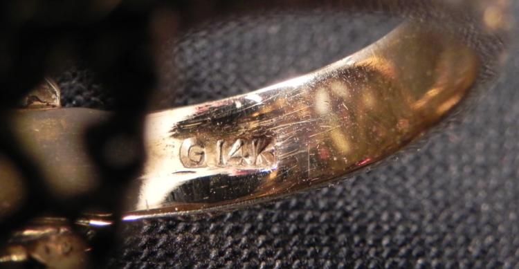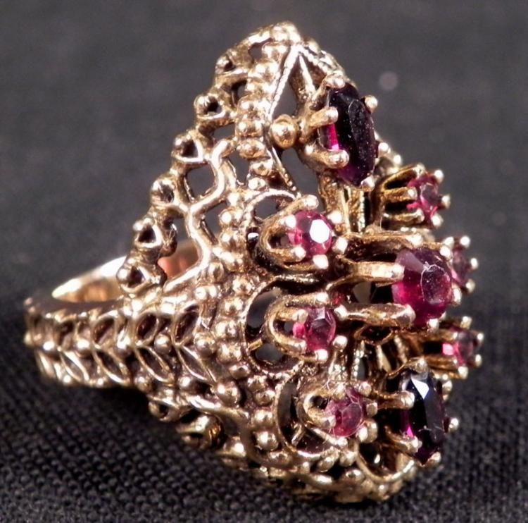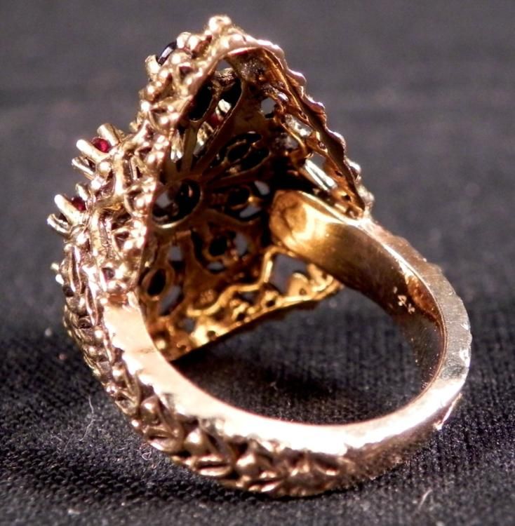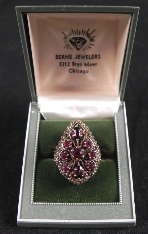This ring has rubies in an intricate gold settting, with beaded and wavy designs, and leaf pattern around the band. * * * Weight: 2 grams * Ring Size: 6 * Content: 14K yellow gold * Rubies: Nine, in round and oval shapes * * The hinged plastic box is from Berne Jewelers, Chicago. *