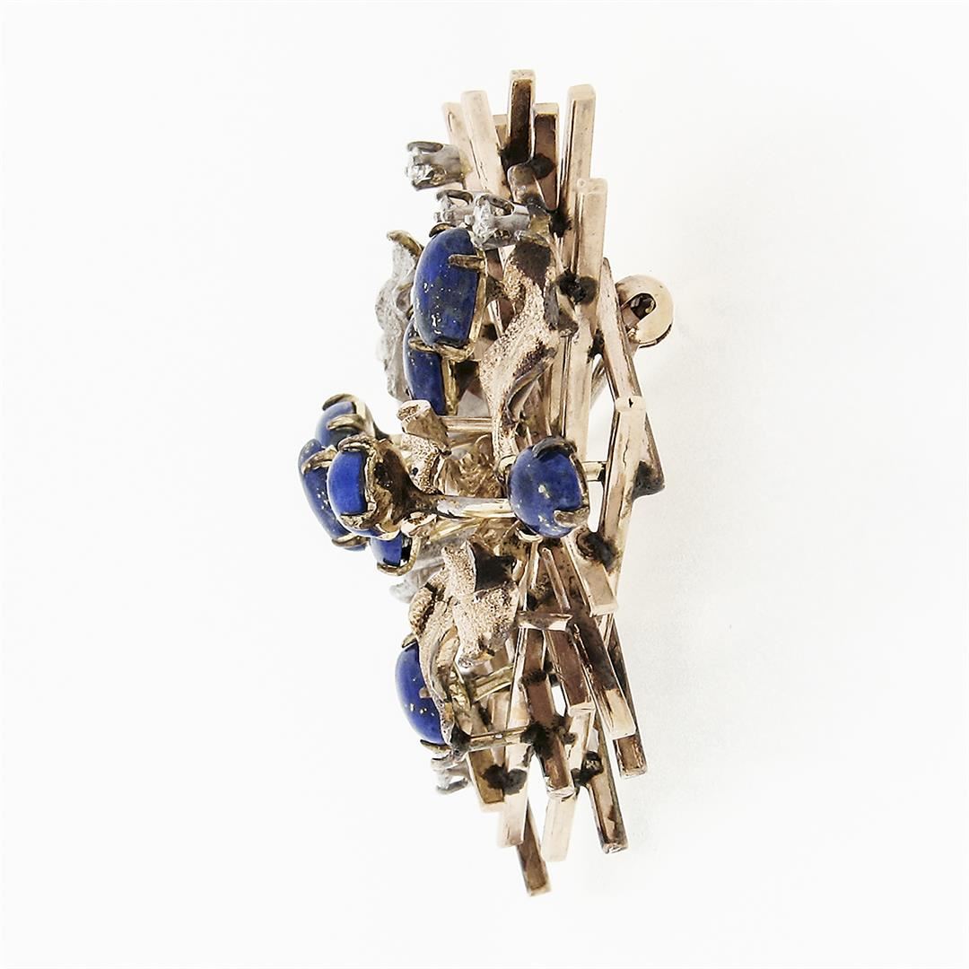 A vintage solid 14k yellow, rose & white gold grid leaf pin brooch, with 9 oval cabochon cut natural lapis (7.0x5.0mm), and 5 round brilliant cut natural diamonds (VS2 ; G - 0.20ctw). Measures 45x61.5mm and weighs a total of 20.09 grams.