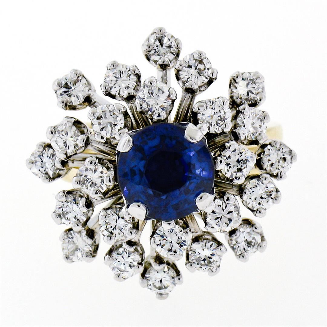 A vintage solid yellow and white gold snowflake ring, featuring 1 round brilliant cut natural sapphire (1.82ct), surrounded with a halo of 24 round brilliant cut natural diamonds (F/G - VVS2/VS1; 1.44ctw). The ring is size 4.0, weighs a total of 10.52 grams, and measures 20.90mm wide.