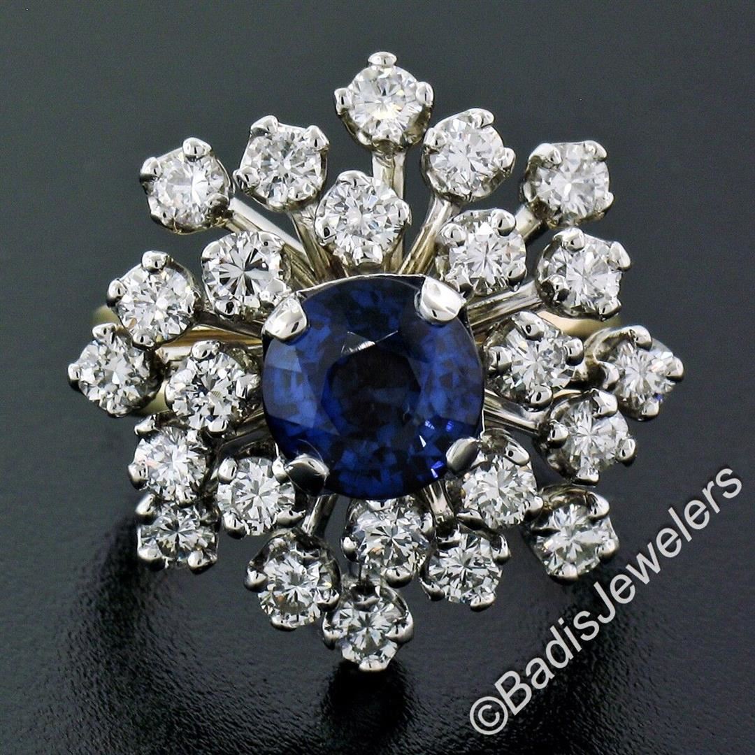 A vintage solid yellow and white gold snowflake ring, featuring 1 round brilliant cut natural sapphire (1.82ct), surrounded with a halo of 24 round brilliant cut natural diamonds (F/G - VVS2/VS1; 1.44ctw). The ring is size 4.0, weighs a total of 10.52 grams, and measures 20.90mm wide.