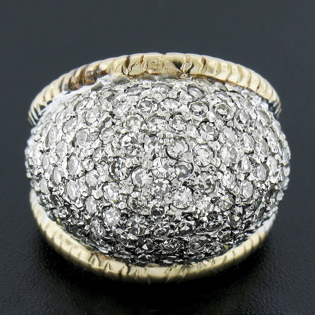 A vintage solid 14k yellow & white gold Bombe wide ring, featuring numerous of round cut natural diamonds (G-I - VS1-SI2 ; 4ctw). The ring is size 6.5, weighs a total of 16.7 grams, and measures 20.8mm wide.
