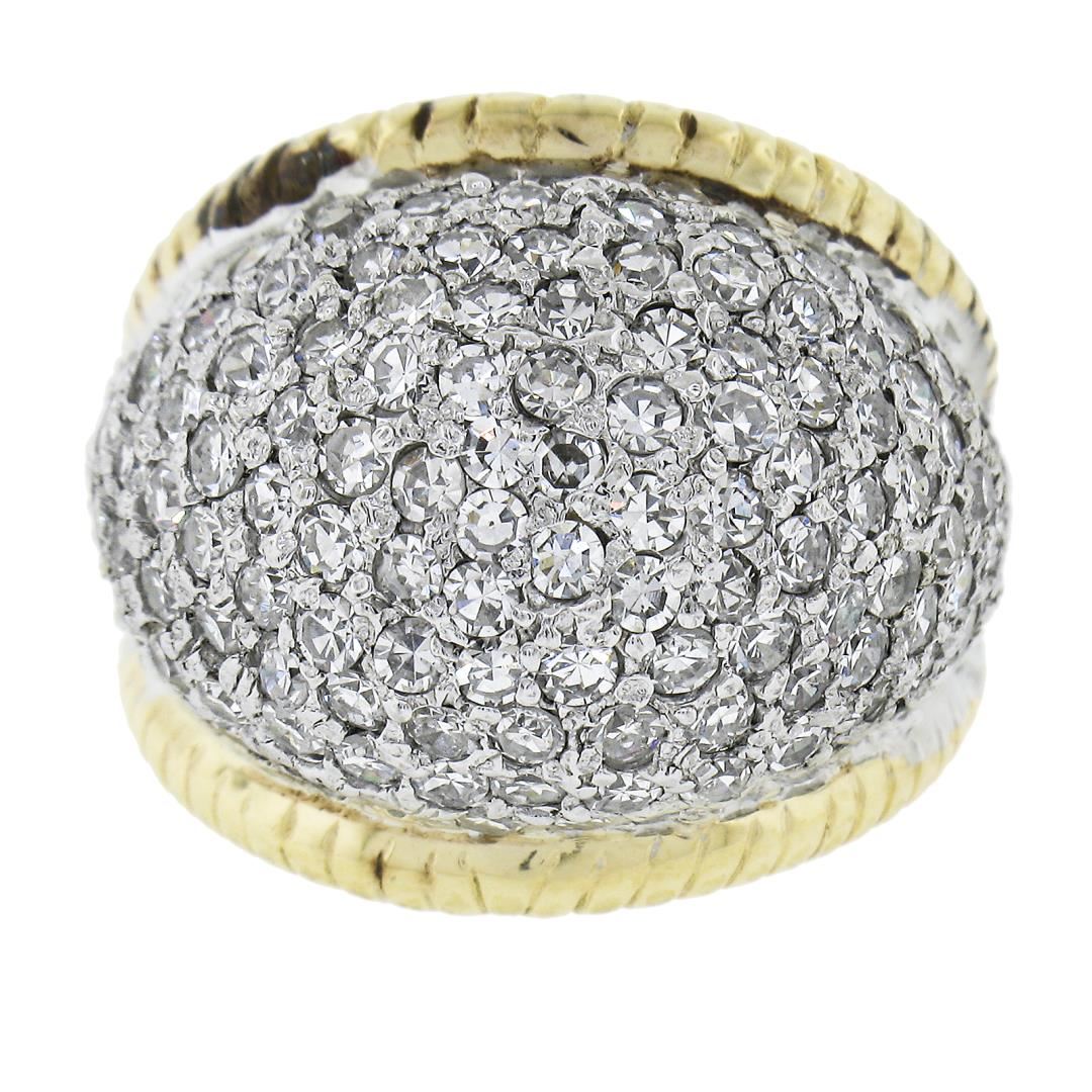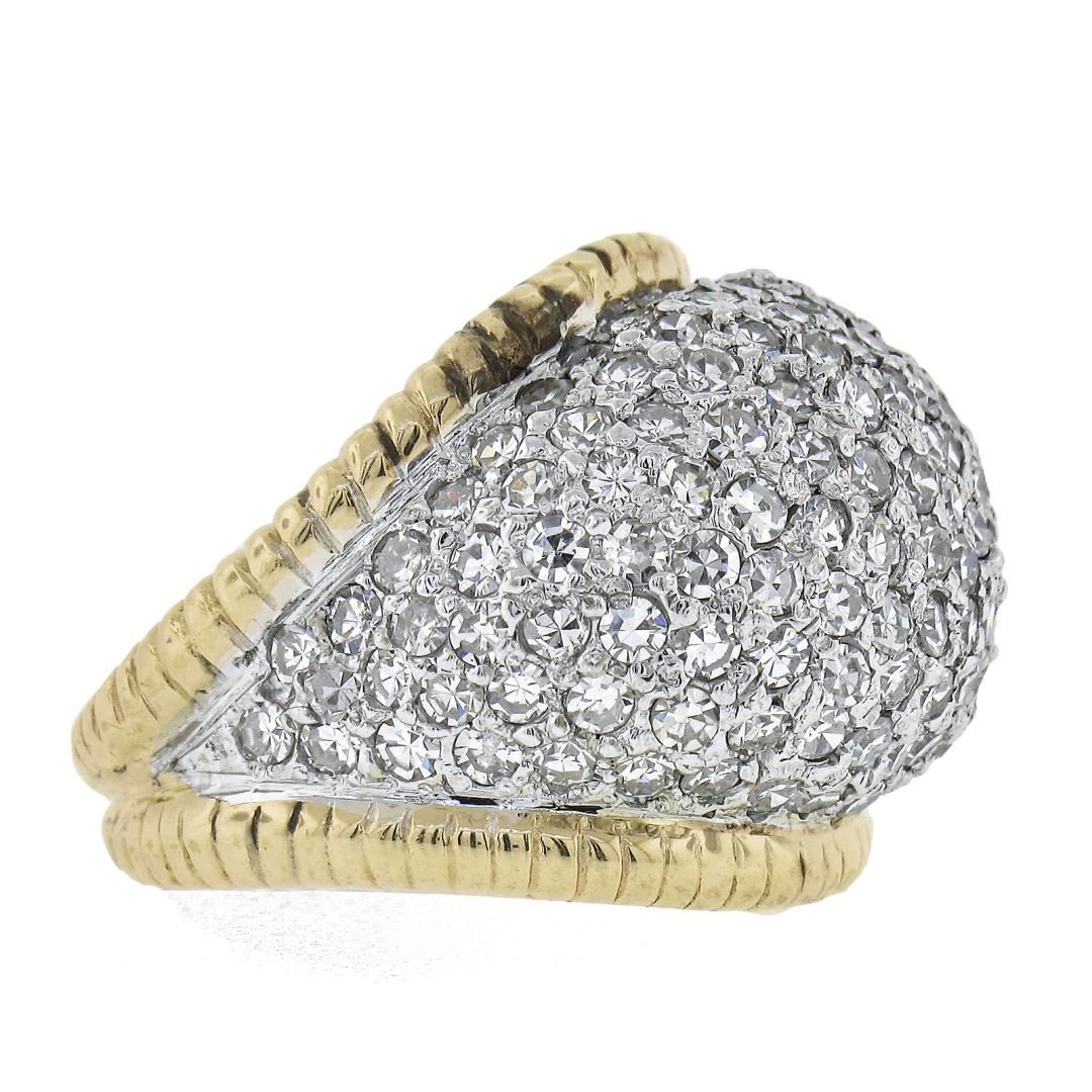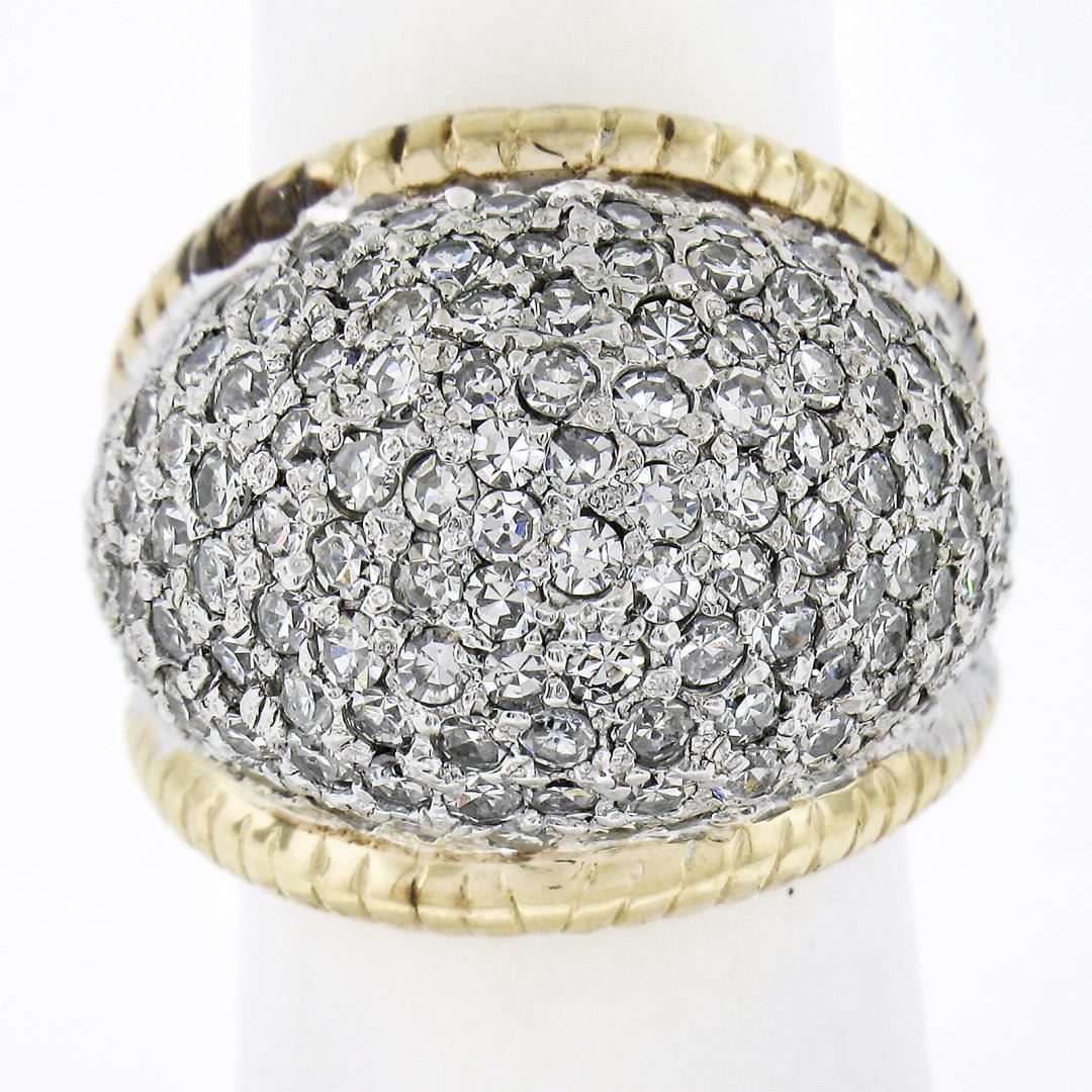 A vintage solid 14k yellow & white gold Bombe wide ring, featuring numerous of round cut natural diamonds (G-I - VS1-SI2 ; 4ctw). The ring is size 6.5, weighs a total of 16.7 grams, and measures 20.8mm wide.