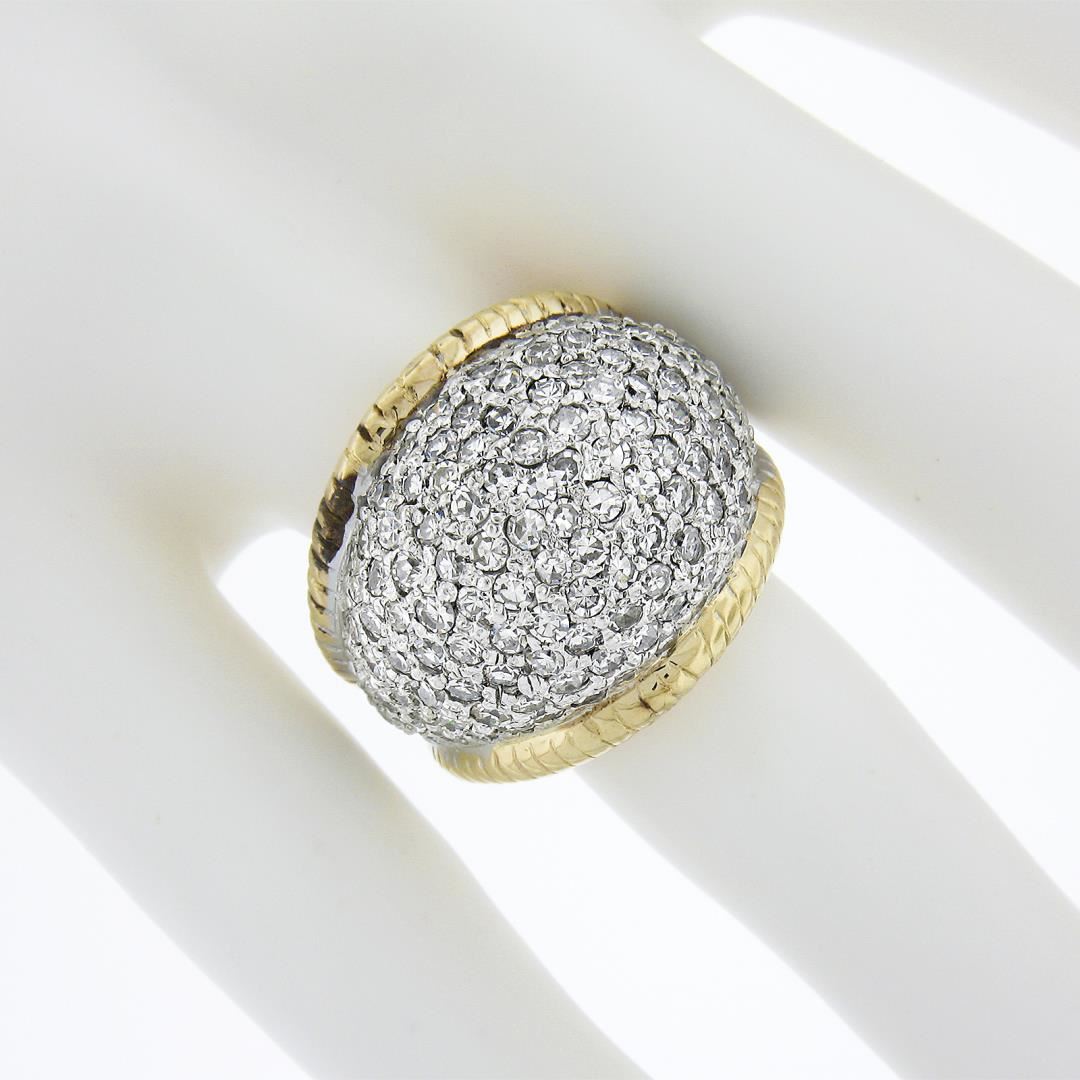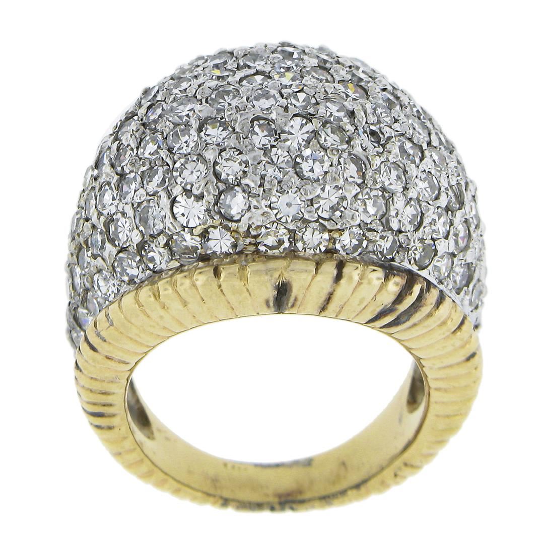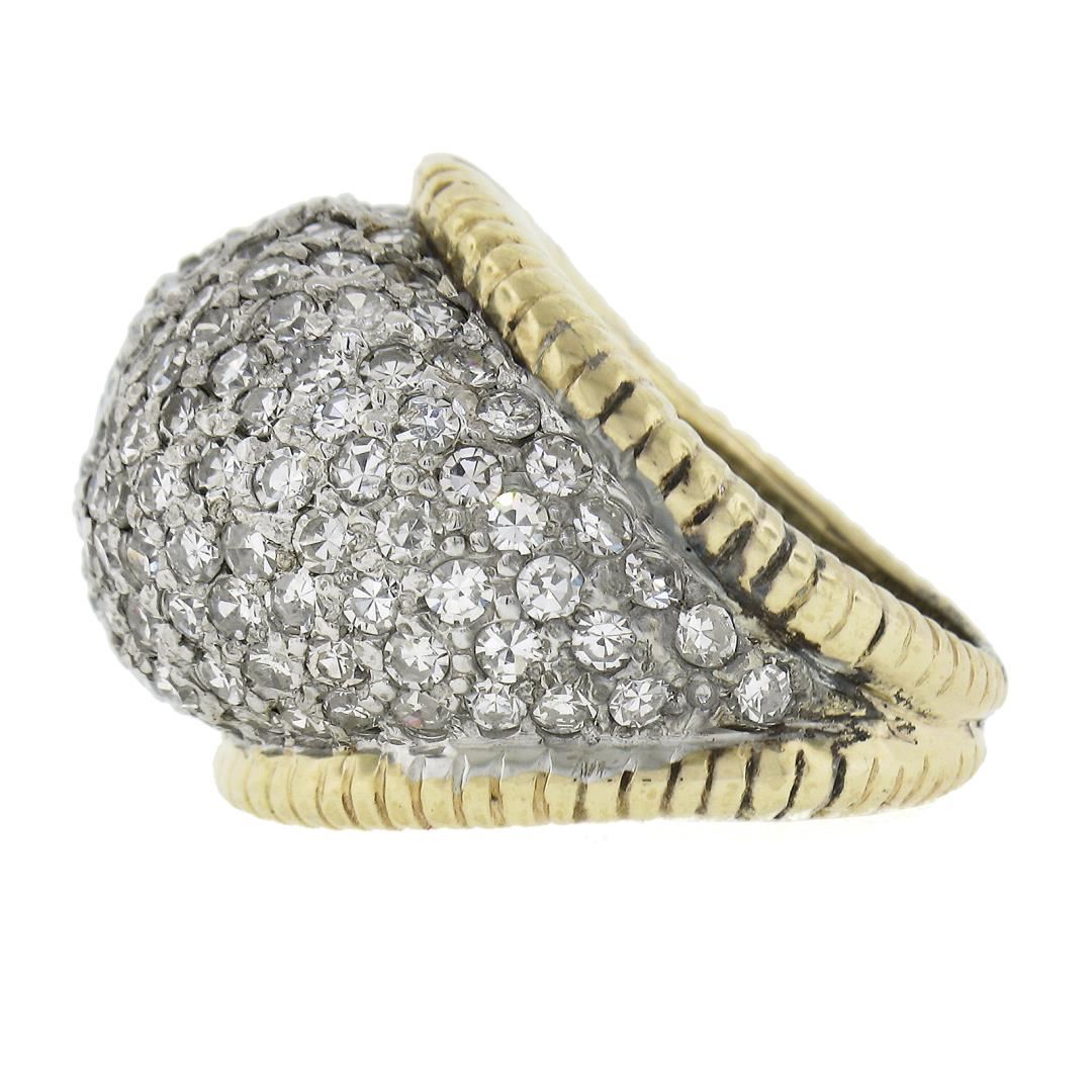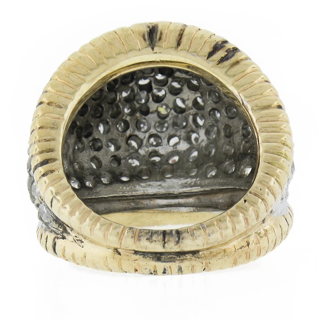 A vintage solid 14k yellow & white gold Bombe wide ring, featuring numerous of round cut natural diamonds (G-I - VS1-SI2 ; 4ctw). The ring is size 6.5, weighs a total of 16.7 grams, and measures 20.8mm wide.