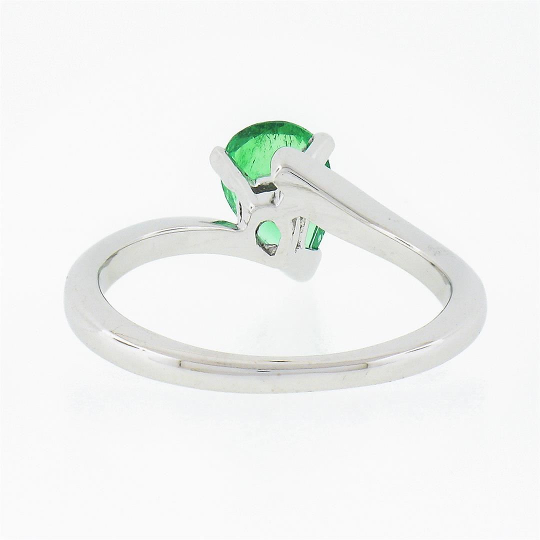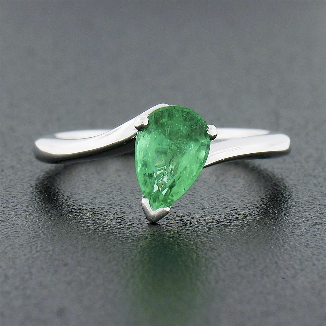 A vintage solid 14k white gold solitaire bypass ring, with 1 pear cut natural emerald (0.71ctw). The ring is size 4.5, weighs a total of 2.08 grams, and measures 7.90mm wide.