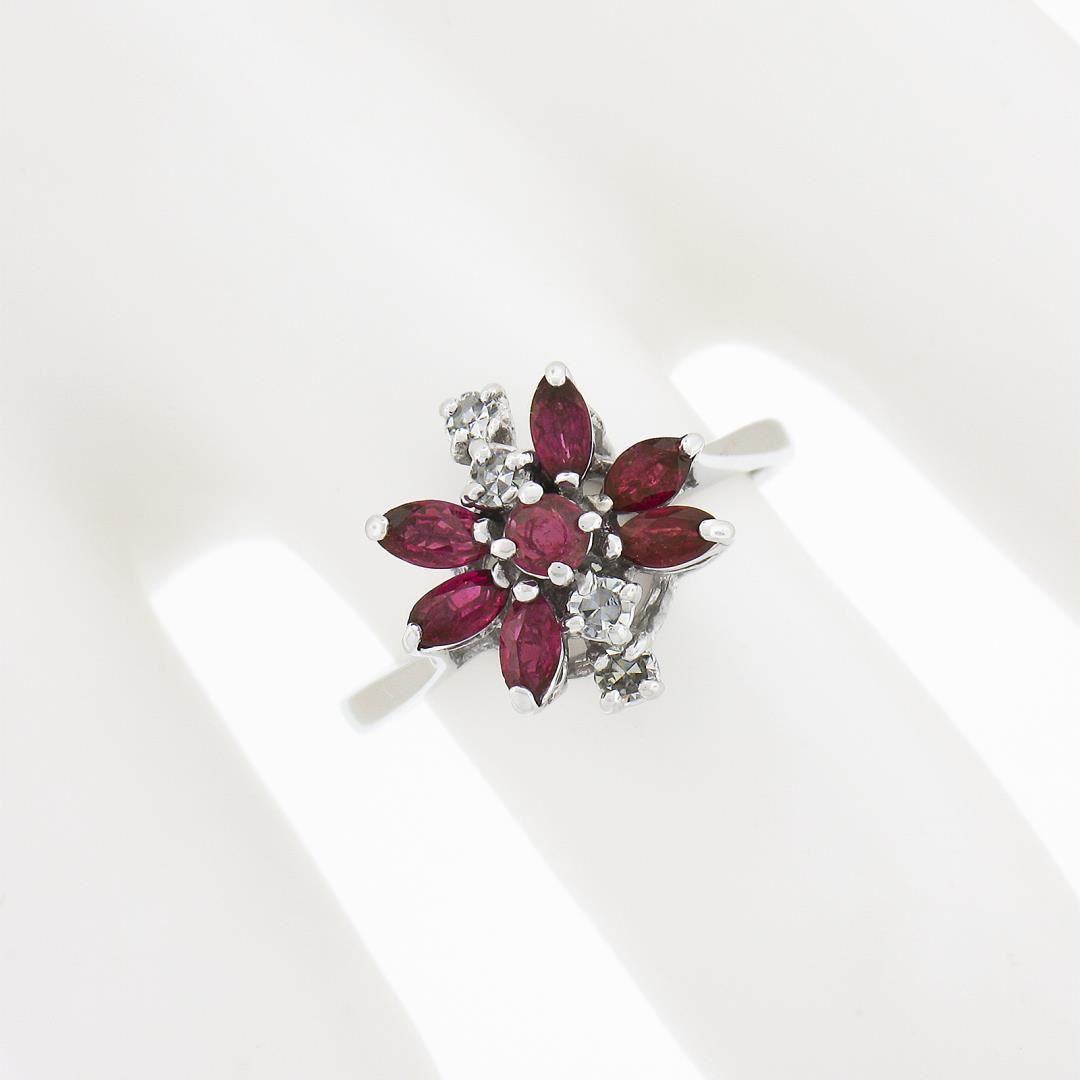 A vintage solid 14k white gold spray ring, with 6 marqiuse cut & 1 round cut natural rubies ( 0.70ctw ), and 4 old single cut natural diamonds (H - VS2 ; 0.10ctw). The ring is size 5.5, weighs a total of 2.56 grams, and measures 12.2mm wide.