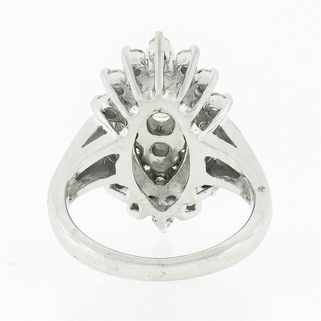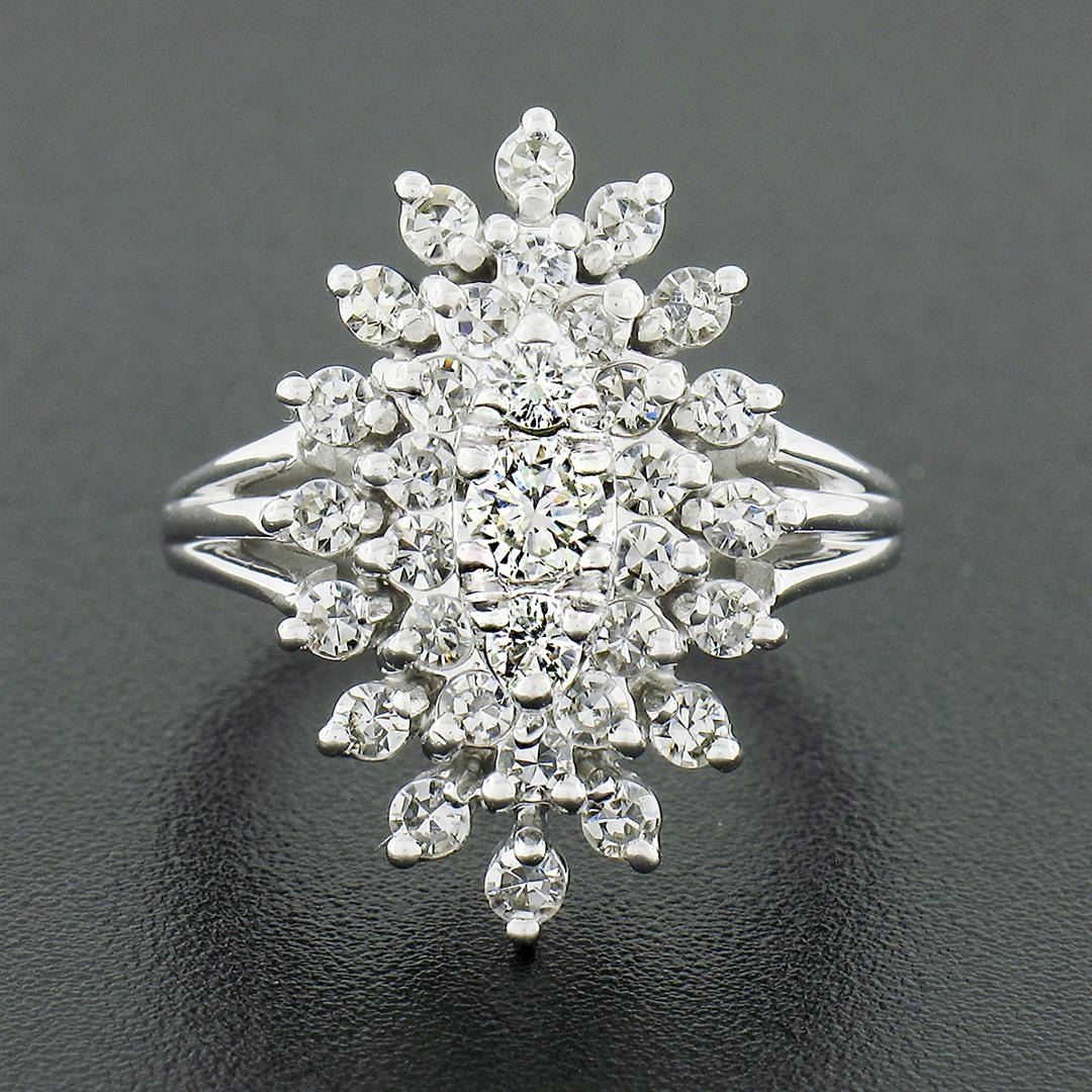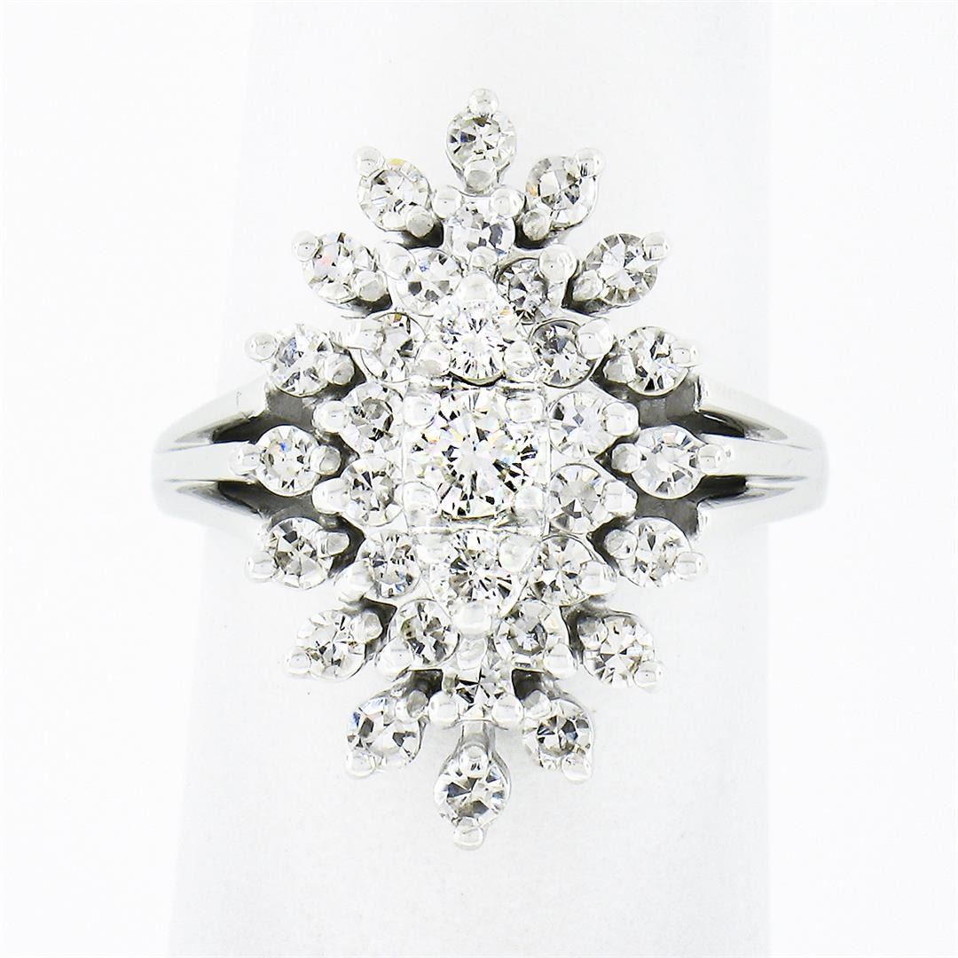 A solid 14k white gold navette tiered ring, with 3 old transitional cut natural diamonds (G/I - VS2/SI1 ; 0.23ctw), and 30 old single cut natural diamonds (G/I - VS2-SI2; 0.80ctw). The ring is size 4.5, weighs a total of 6.48 grams, and measures 20mm wide