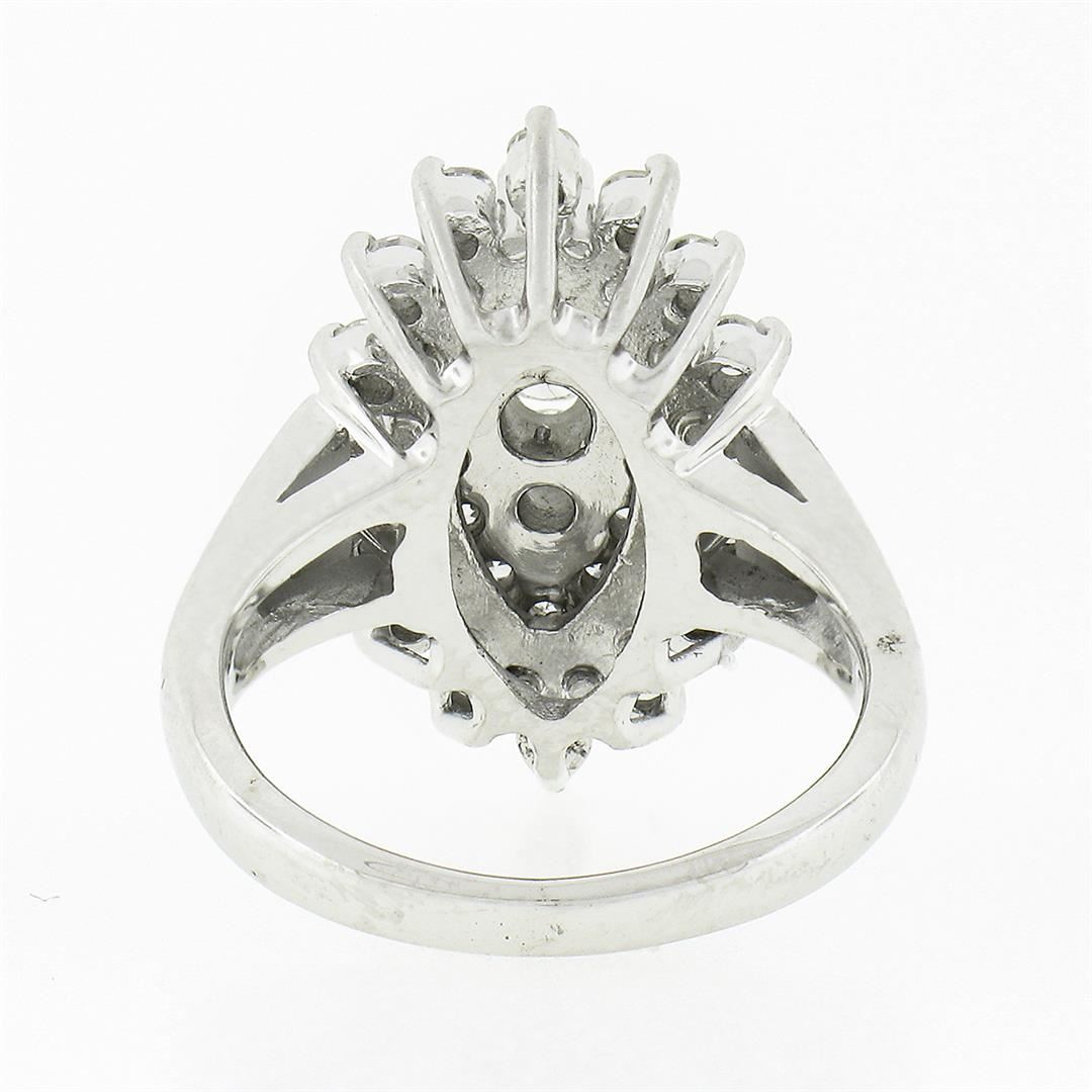 A solid 14k white gold navette tiered ring, with 3 old transitional cut natural diamonds (G/I - VS2/SI1 ; 0.23ctw), and 30 old single cut natural diamonds (G/I - VS2-SI2; 0.80ctw). The ring is size 4.5, weighs a total of 6.48 grams, and measures 20mm wide.