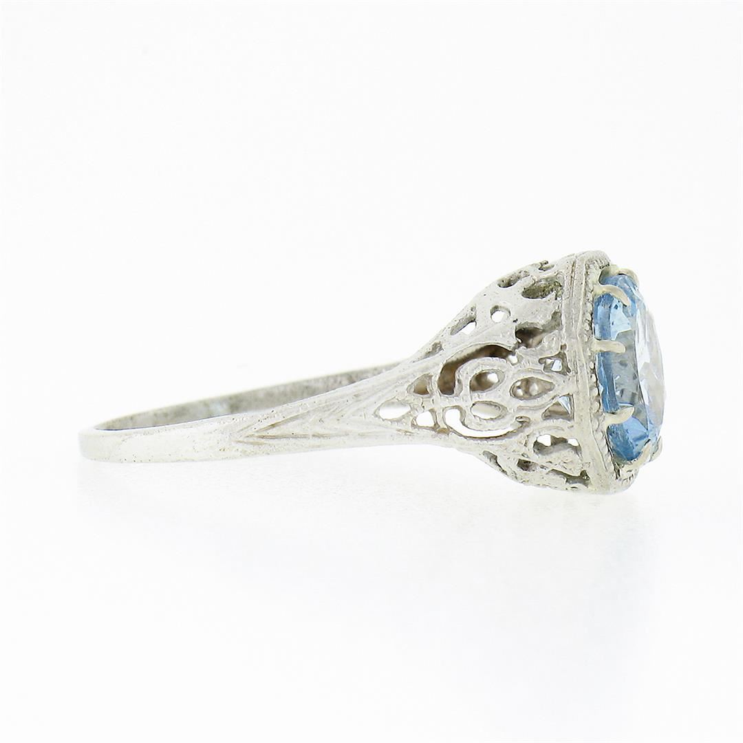 A vintage solid 14k white gold solitaire ring, with 1 round cut natural aquamarine (1.32ct). The ring is size 6.0, weighs a total of 2.23 grams, and measures 9.55mm wide.