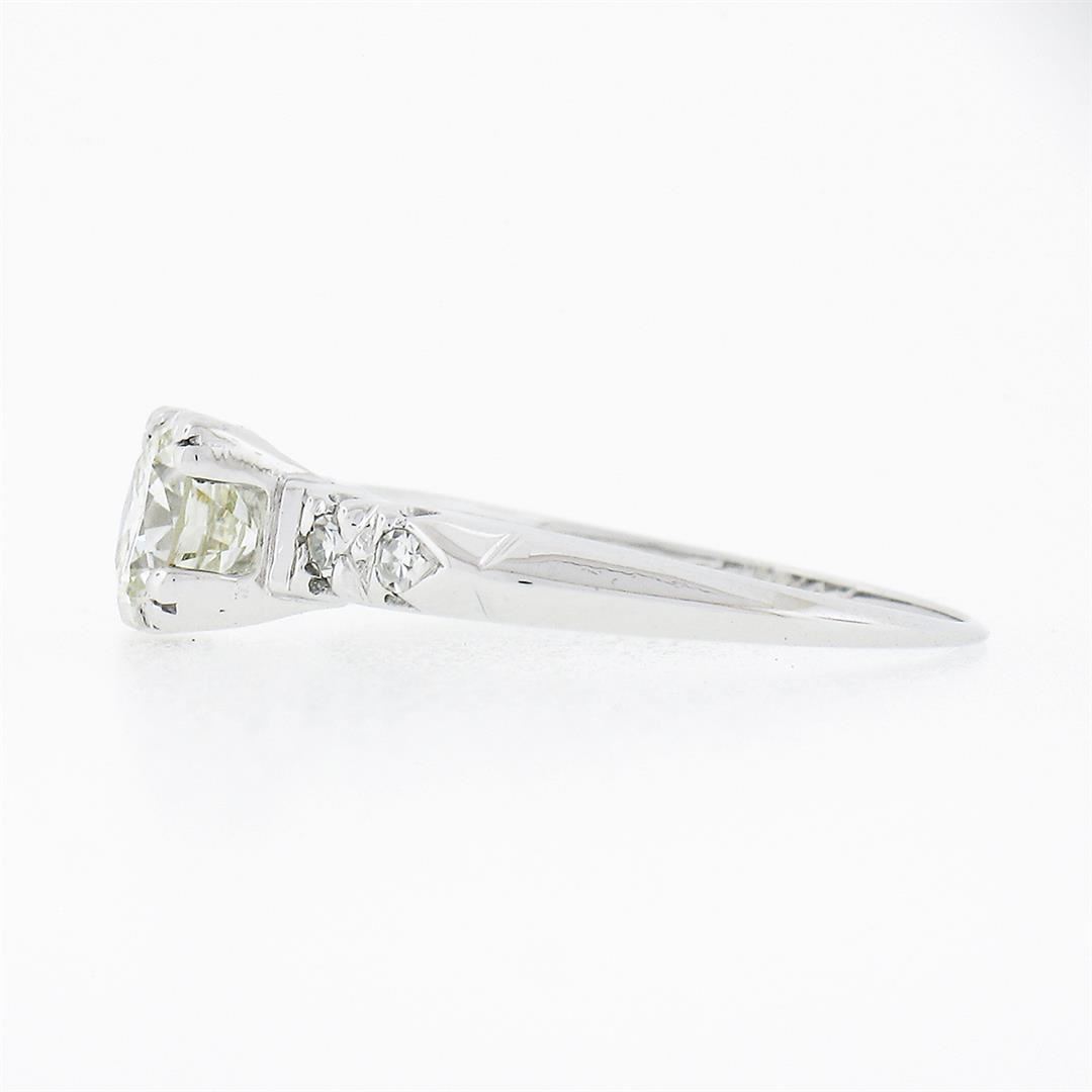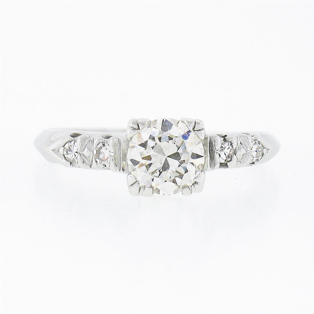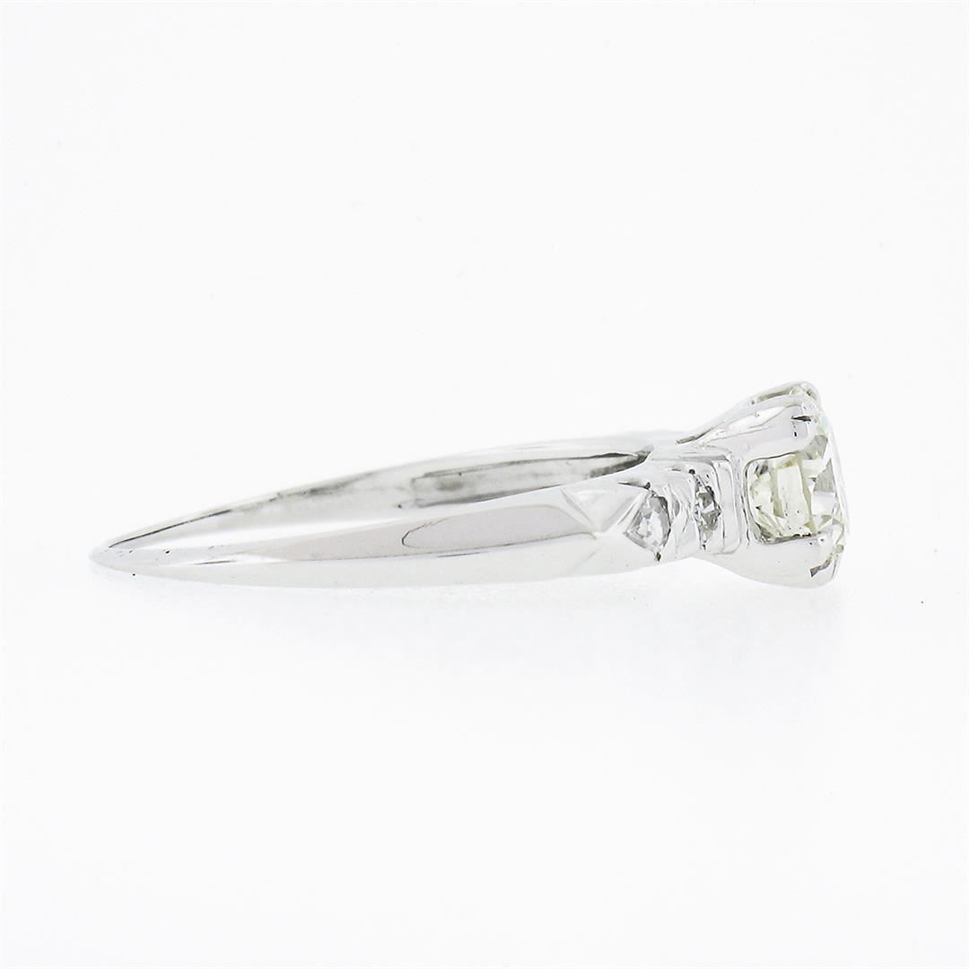 A vintage solid 14k white gold engagement ring, with 1 old transitional cut natural diamond (H - VS2 ; 0.65ct ), accented with 4 old single cut natural diamonds (G/H - VS1/VS2 ; 0.08ctw). The ring is size 5.5, weighs a total of 1.61 grams, and measures 5.6mm wide.