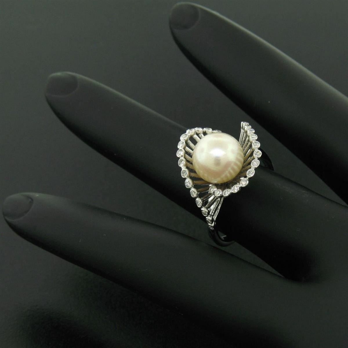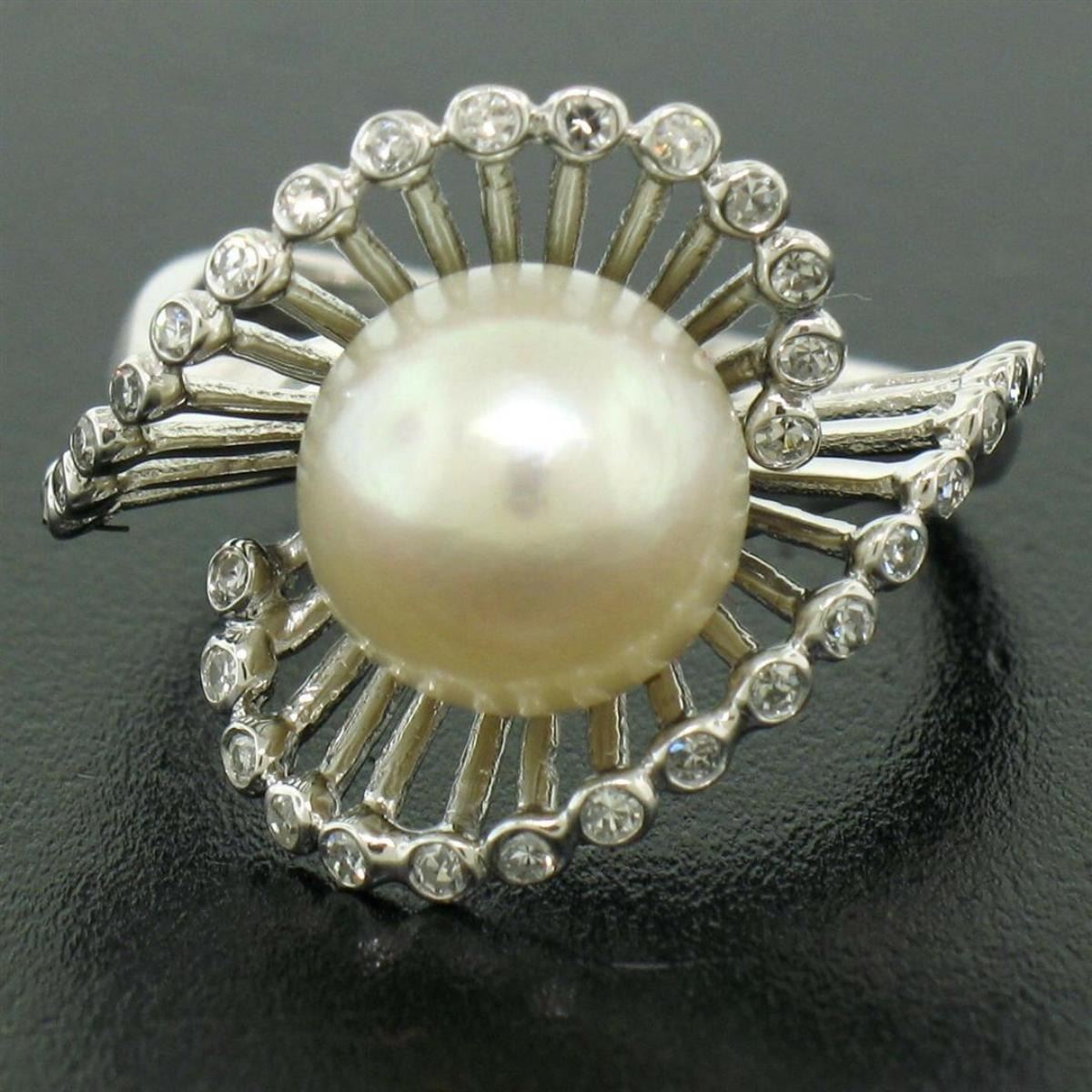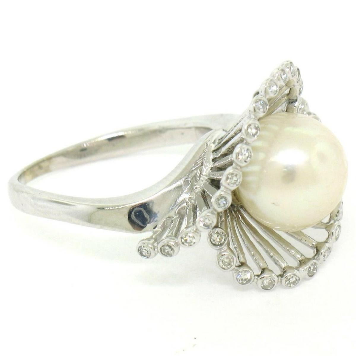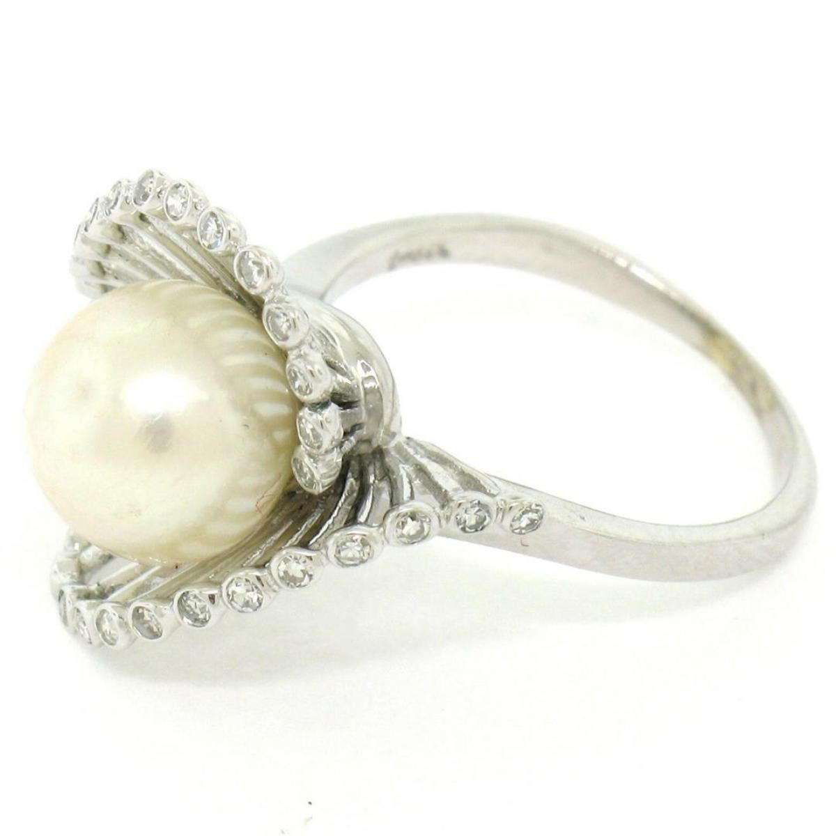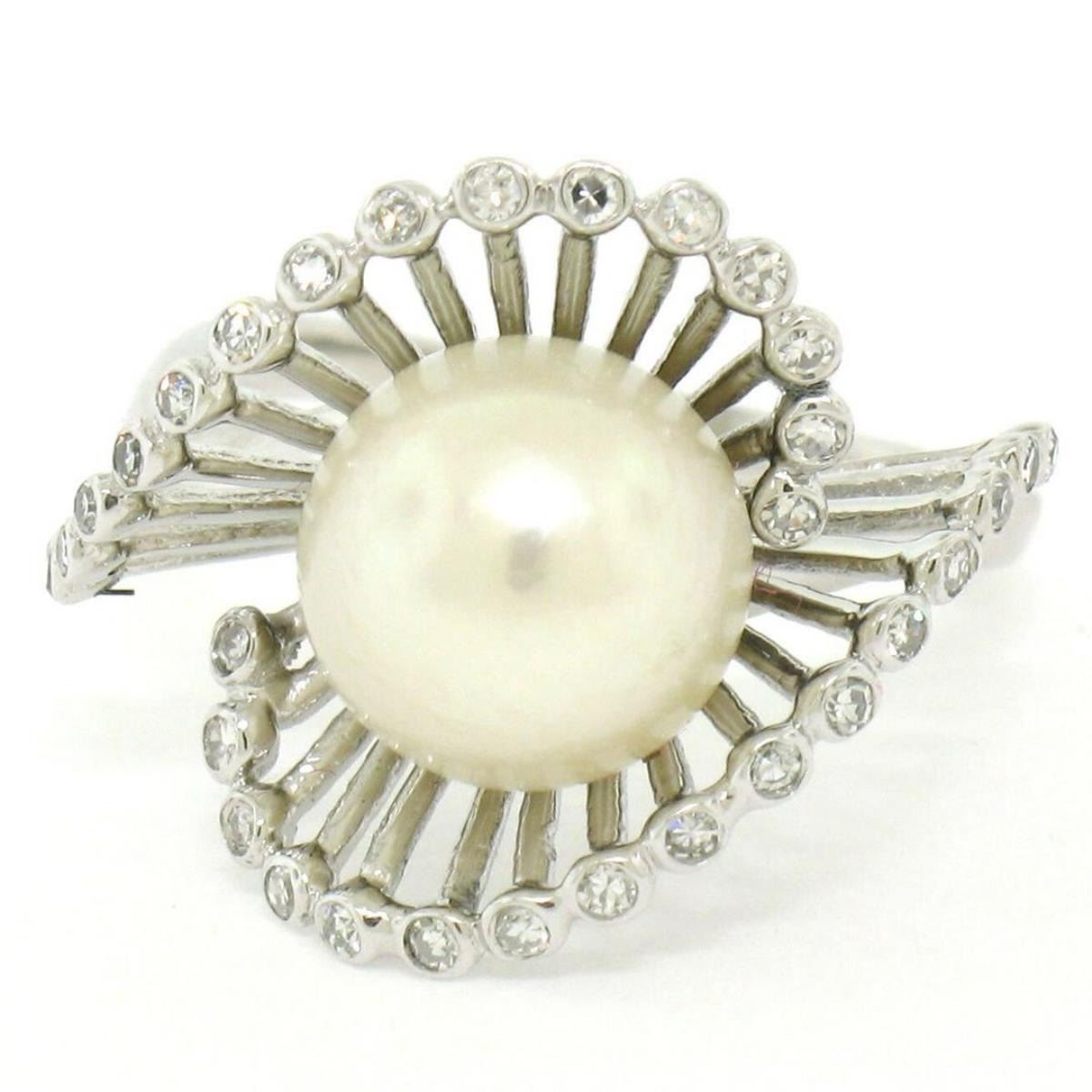 One Vintage 14K White Gold 8.5mm Pearl & 0.50ctw Diamond 2 Wave Bypass Cocktail Ring. Item Details: Material: 14K Solid White Gold, Weight: 4.55 Grams, Stone(s): (1) Natural Genuine Pearl - Round Shape - Ivory Color w/ Beautiful Luster and Gorgeous Pink Overtones - 8.5mm (approx.), (32) Natural Genuine Diamonds - Round Single Cut - Bezel Set - F/G Color - VS1 Clarity - 0.50ctw (approx.), Ring Size: 4.5 , Ring Width: 16.20mm (at its widest), 2.03mm (the shank), Ring Height: 11.65mm rise off the finger, Condition: Vintage piece. Like new condition!
