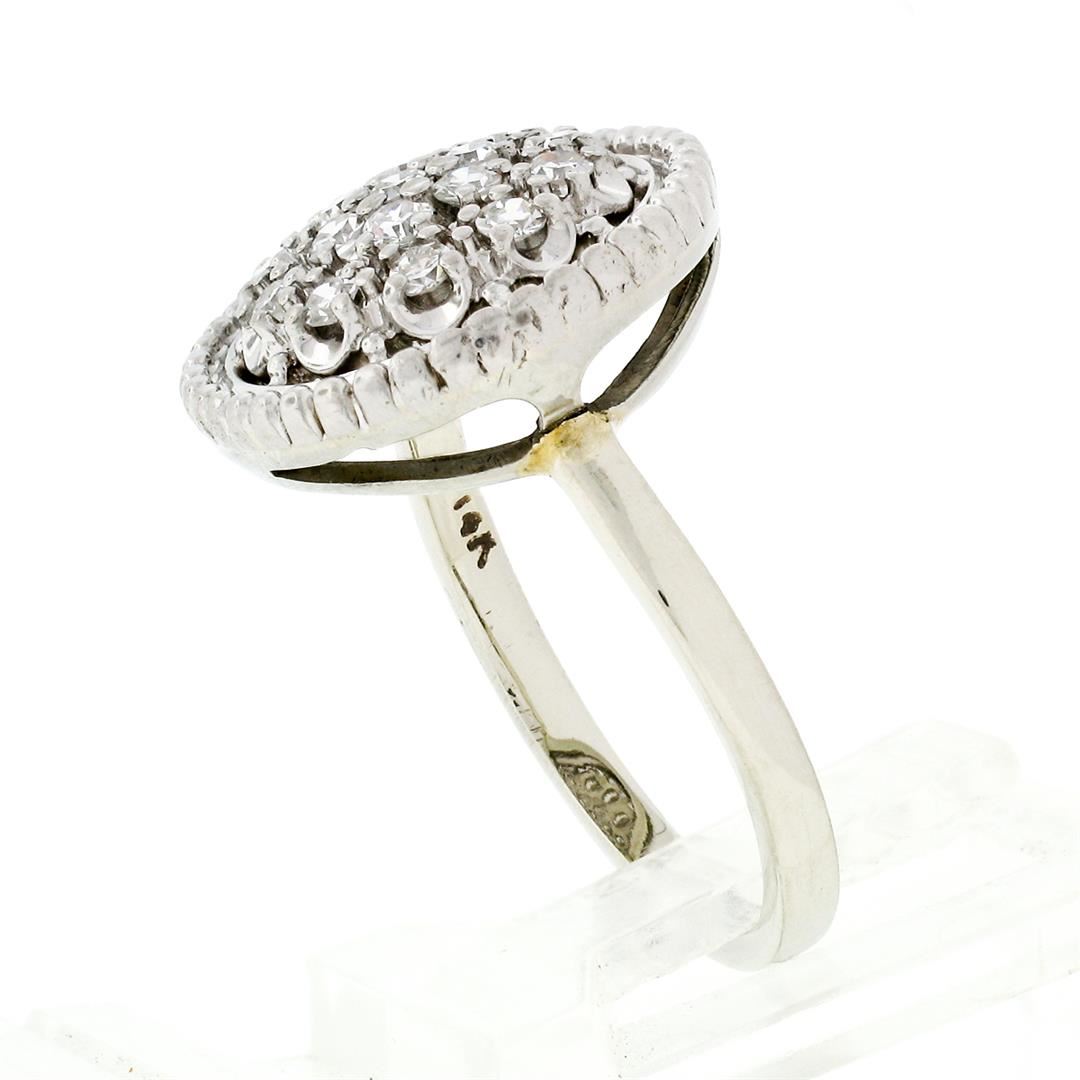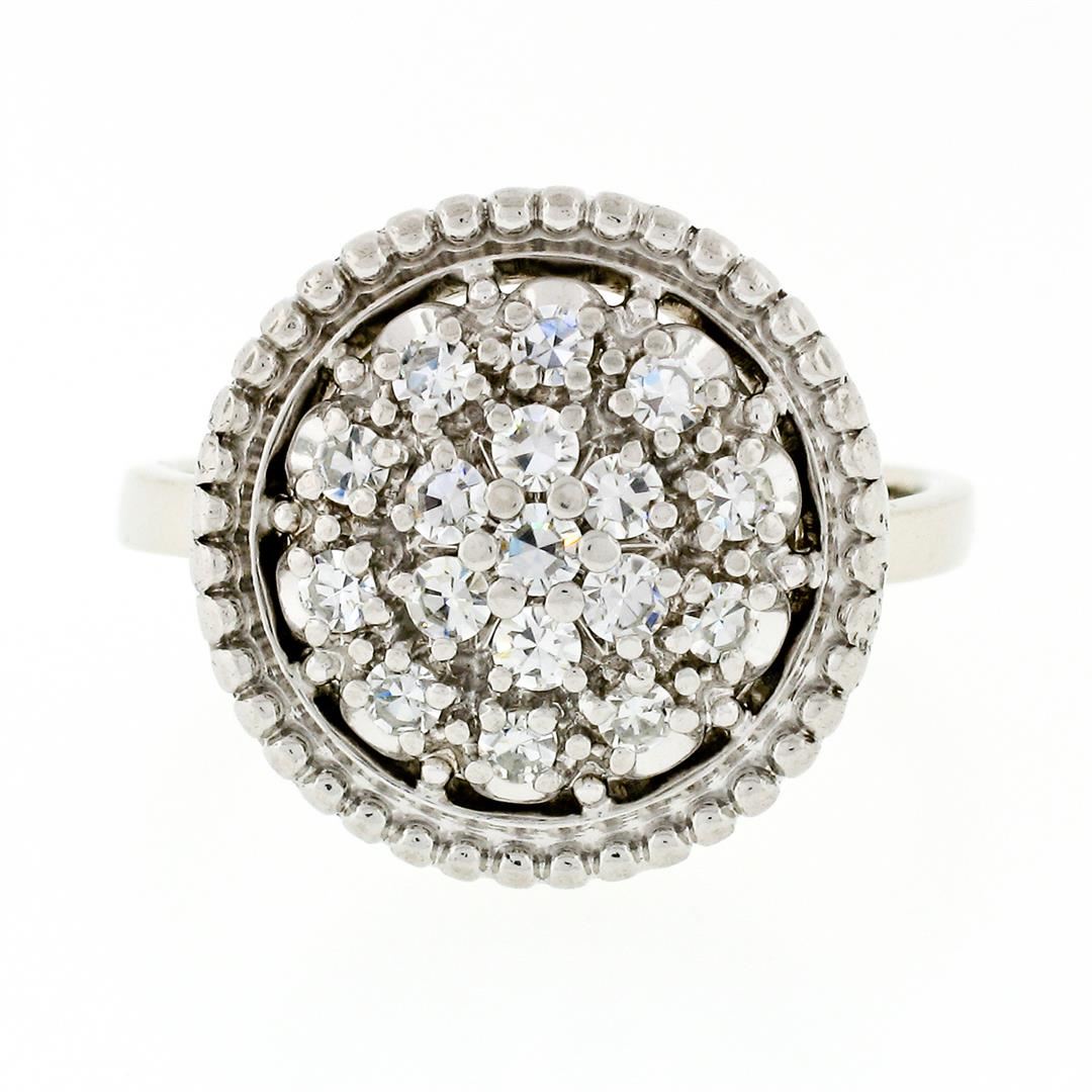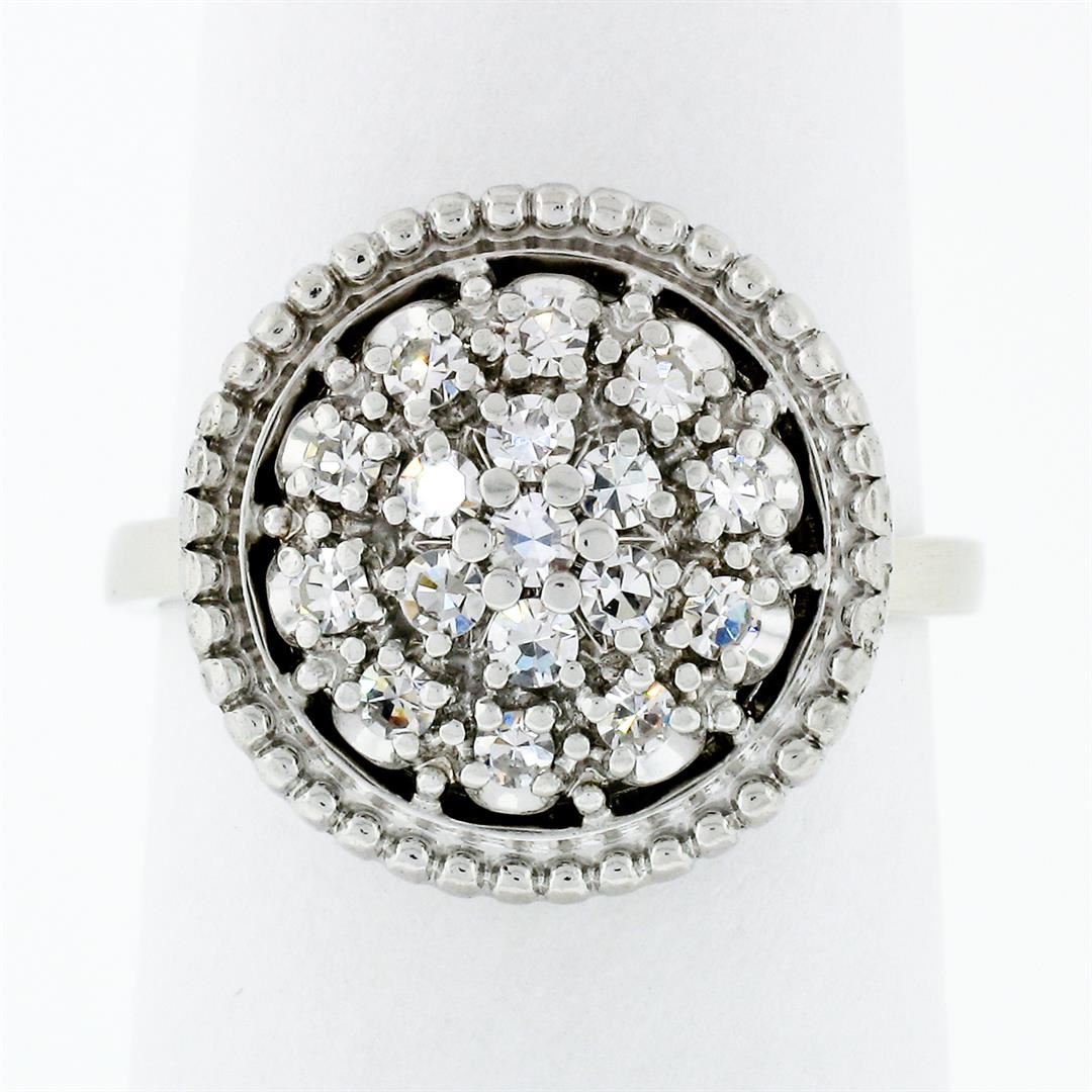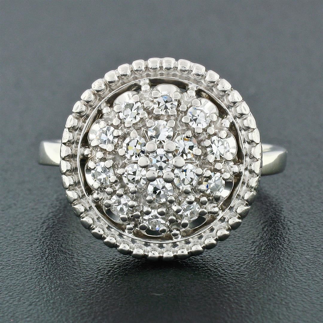 A vintage solid 14k white gold platter cocktail ring with a cluster of 17 natural diamonds (F/G - VVS2/VS1; 0.55ctw). The ring is size 6.5, weighs a total of 4.38 grams, and measures 15mm wide.