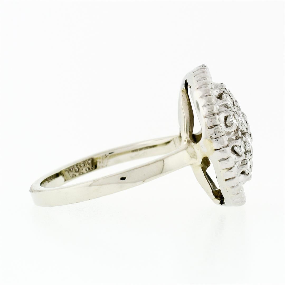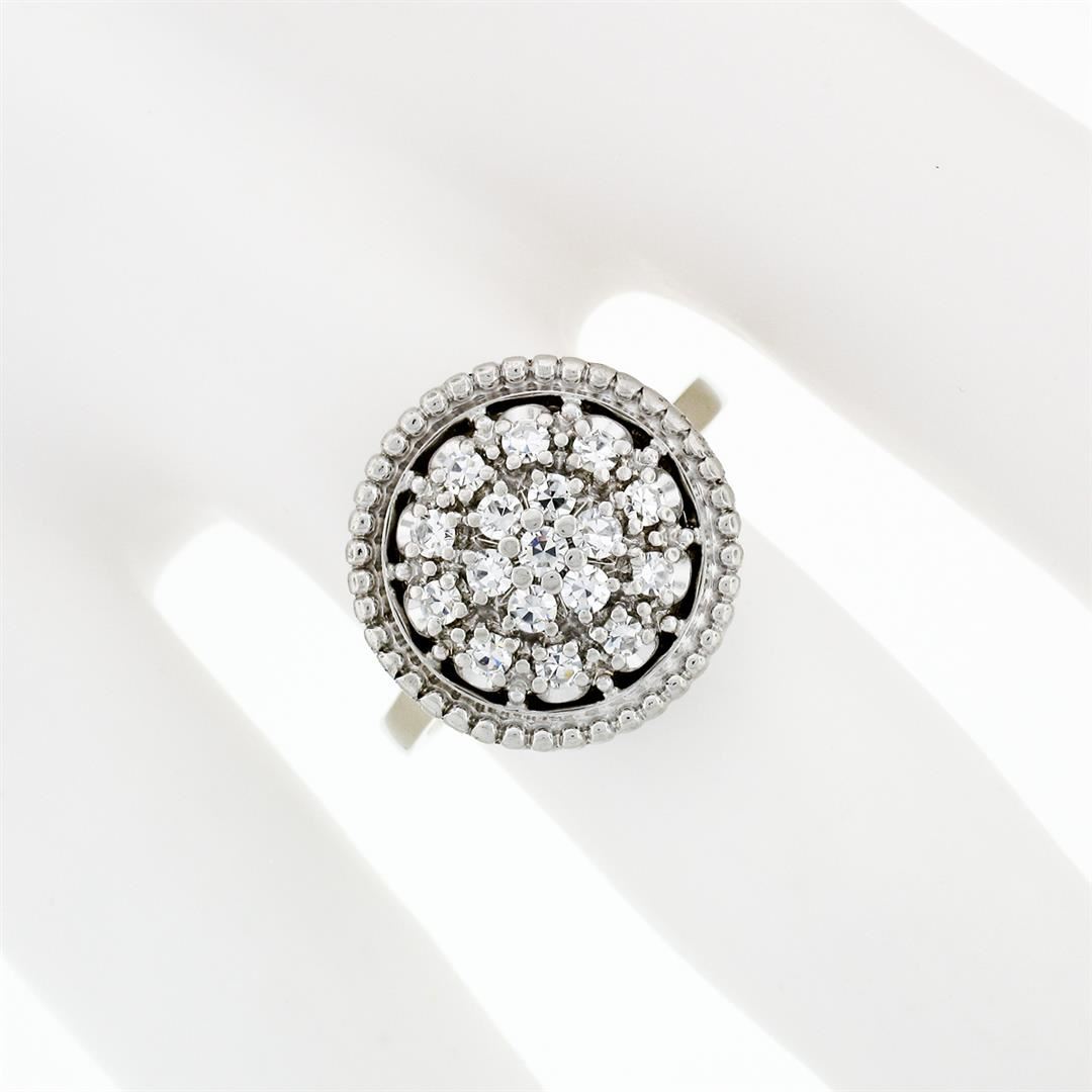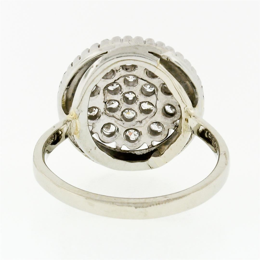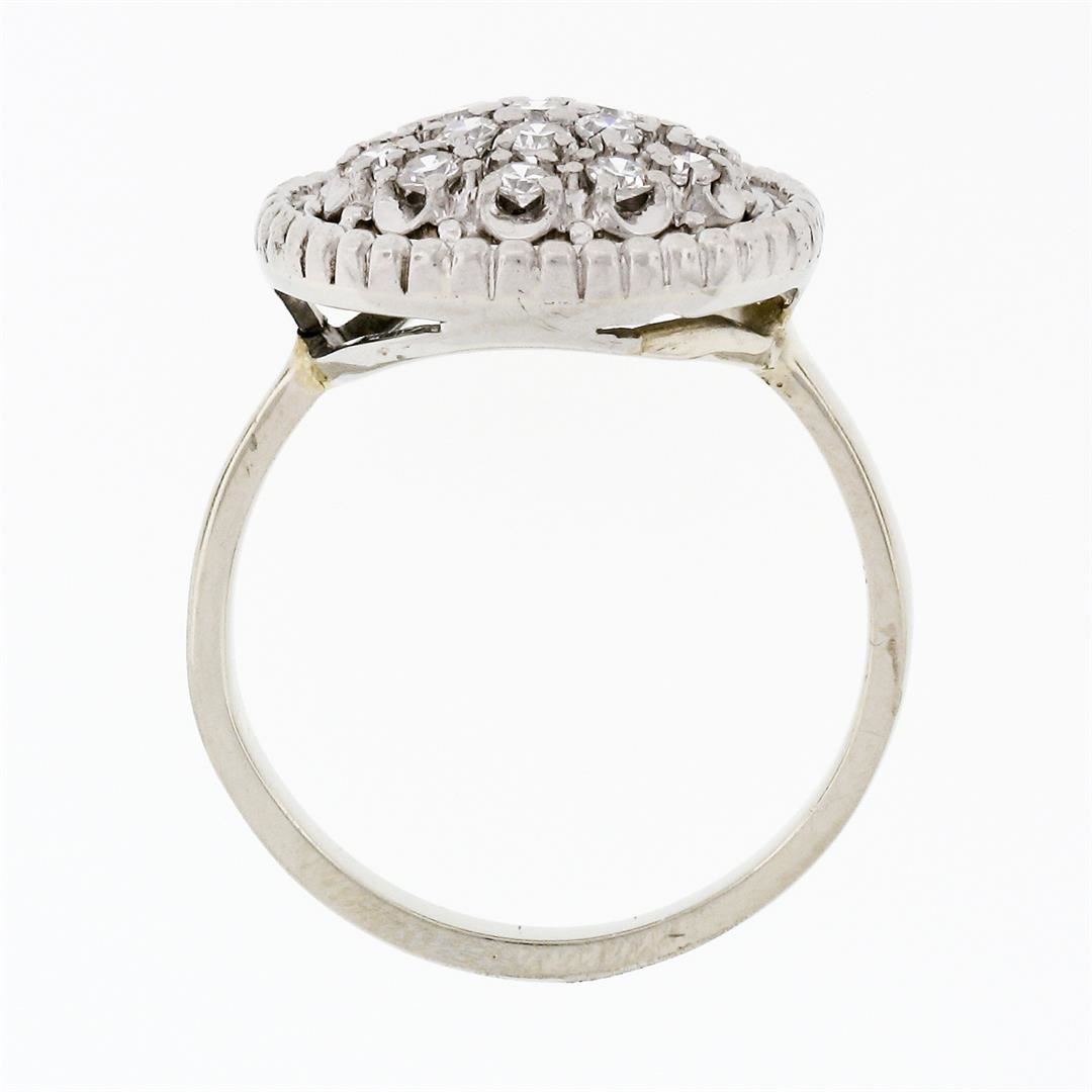 A vintage solid 14k white gold platter cocktail ring with a cluster of 17 natural diamonds (F/G - VVS2/VS1; 0.55ctw). The ring is size 6.5, weighs a total of 4.38 grams, and measures 15mm wide.